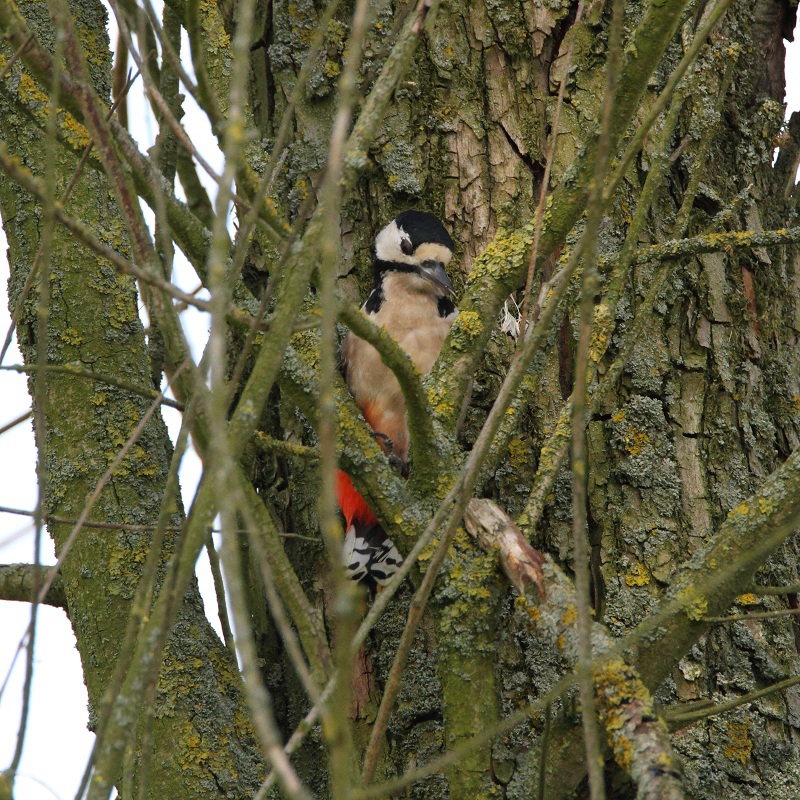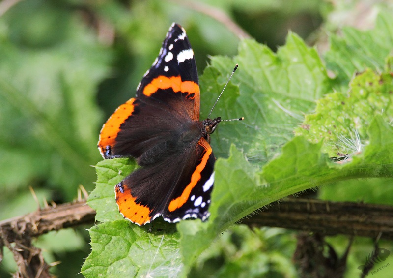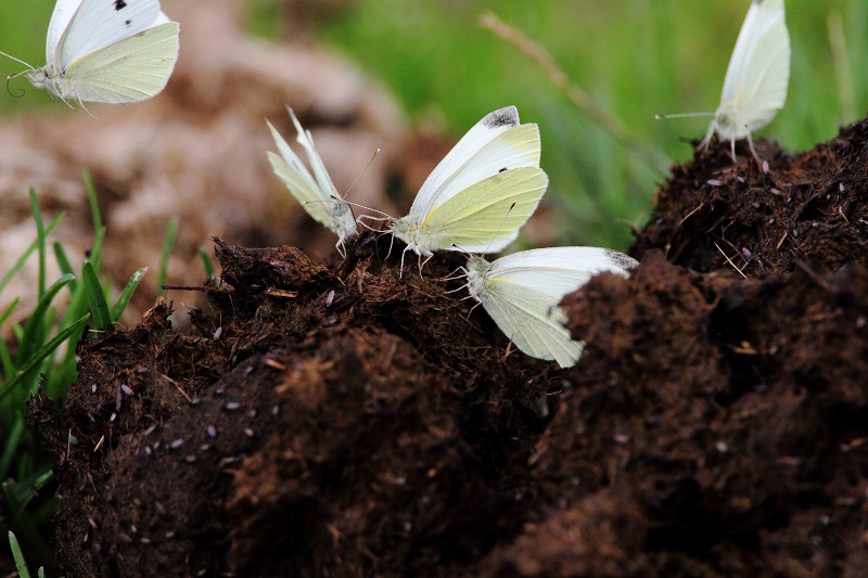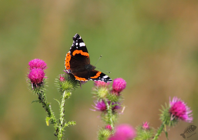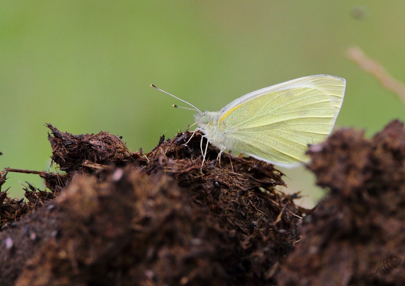 Ik ben doorgelopen richting de Zeearend en zag iets vreemds op de grond, tenminste iets wat ik niet kende: op een hoop paardenmest zaten verschillende Koolwitjes. Ik begrijp dat zij dit doen om mineralen binnen te krijgen, maar had het nog nooit eerder gezien. Het zag er wel apart uit: mooie, elegante, witte vlinders op een hoop mest… Verderop zag ik een meer vertrouwd beeld: een Koolwitje op een Distel. Daar in de buurt zaten ook Atalanta’s en een Grote Bonte Specht.