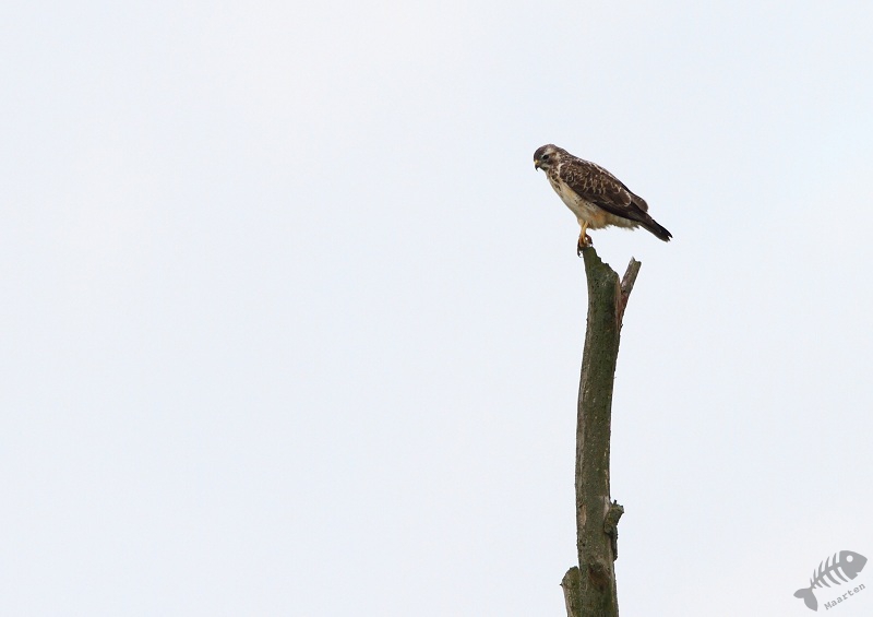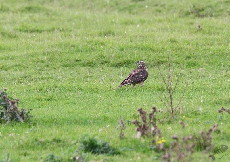 Het meest interessante wat er te zien was, was een vrouwtje Bruine Kiekendief. Ze zat ver weg, op de grond en deed eigenlijk heel weinig. Toen ze opsteeg, leek ze nog verder weg te vliegen. Maar wat deed ze tot mijn enorme verbazing: ze vloog inderdaad eerst weg om daarna recht op de hut af te vliegen en passeerde deze op een paar meter! Zelfs te dichtbij om haar goed vast te leggen (ik ben ook niet snel tevreden…). Terwijl ik nog stond na te hijgen van deze belevenis vloog er iets over de hut en ging aan de overkant er tegenover zitten. Omdat de andere aanwezige vogels dat blijkbaar niet zo konden waarderen, ze vlogen allemaal weg, heb ik eens goed met de verrekijker gekeken en het bleek een (jonge?) Havik te zijn! Twee van zulke geweldige vogels in 5 minuten tijd! Ook hier weer mooie (verre) plaatjes van kunnen maken (die ogen…!).