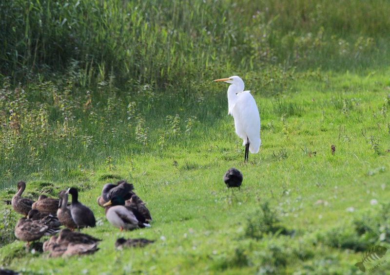 Ik ben weer naar het bezoekerscentrum gereden en op weg daar naartoe, net voor de Knardijk, zat een Buizerd in een bosje. Ik ben snel gestopt en hij bleef zelfs zitten! Ook hier dus weer druk aan het klikken geweest, waarna ik de auto geparkeerd heb en ben begonnen aan mijn vaste rondje. Vanuit Wigbels Eiland was er niet zo veel te zien dus ben ik doorgelopen naar de Brandgans. Ook hier zaten enkele Eenden en Meerkoetjes op het water en op het land. Recht tegenover de hut stond een Grote Zilverreiger, omringt door Eenden en Meerkoetjes.