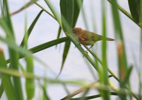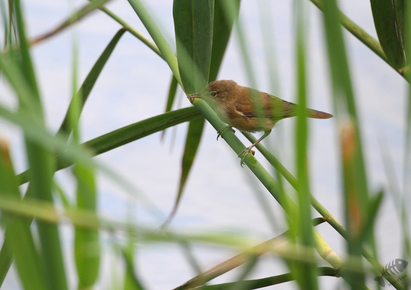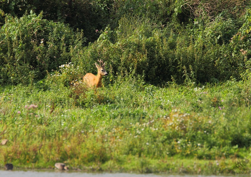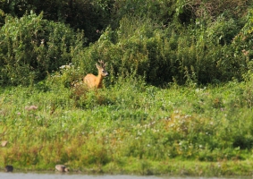 Eerst dus de Poelruiter voor de IJsvogel. Ik heb er ongeveer een uur gezeten, helaas wilde de IJsvogel niet komen, maar een Kleine Karekiet en Tafeleend wel. Helemaal aan de overkant van de plas landde een Buizerd op een paaltje. Om te kijken wat mijn lens kon, heb ik hier ook enkele foto’s van gemaakt. Door ze niet té veel uit te vergroten, zijn het best mooie foto’s geworden. Nadat een Fuut even liet zien dat hij bijna op het water kon lopen, heb ik de Poelruiter verlaten en ben verdergelopen naar de Krakeend. Ook daar was het met vogels rustig. Nog een enkele Zwaluw vloog er rond en er zwommen wat Eenden en Meerkoetjes. Op een bepaald moment zag ik iets bewegen aan de overkant van het water. Uit de bossage kwam een Ree gelopen welke even naar het water kwam. Hij bleef er maar heel kort en leek heel erg op z’n hoede. Of hij nou in de gaten had dat ik aan de andere kant van het water zat?