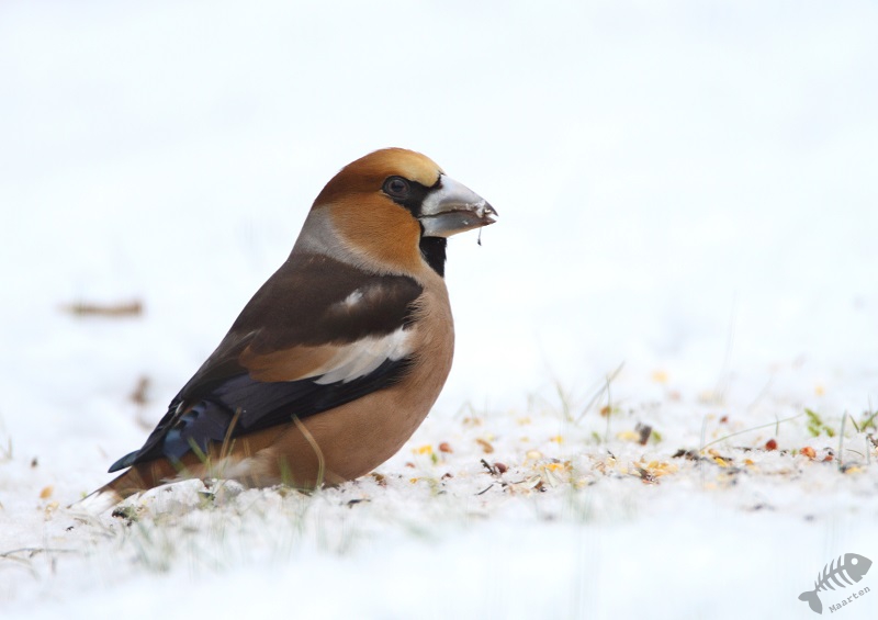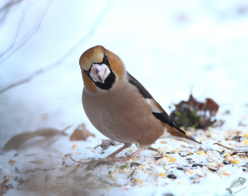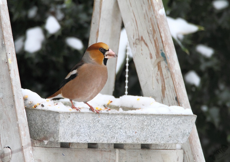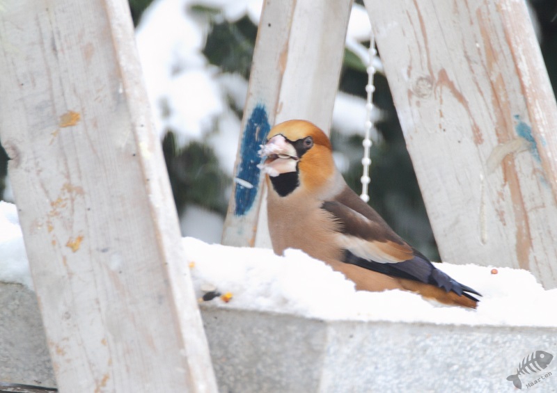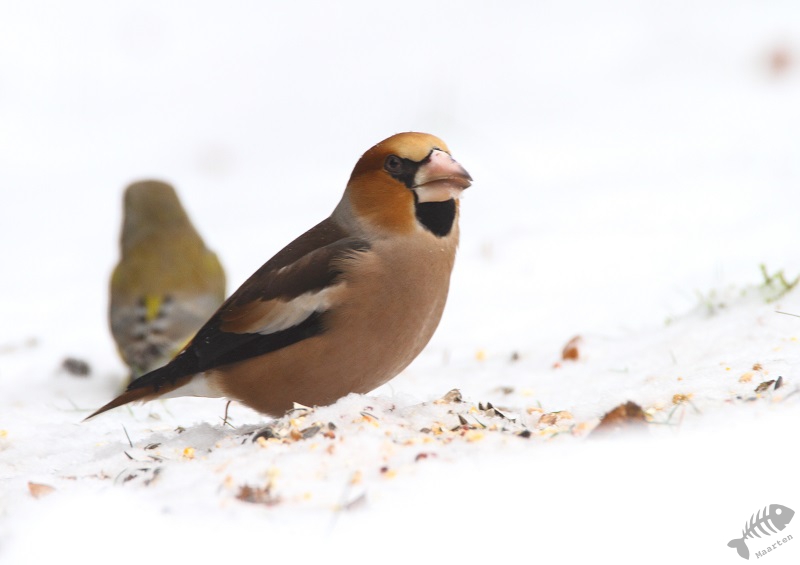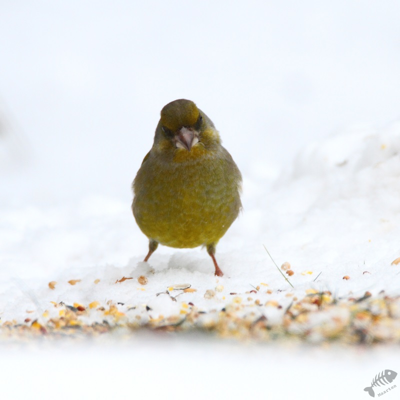 Na een dag, misschien wel vanwege de vorst en de sneeuw, verschenen de eerste vogels al. En wat voor een vogels! Het begon met een heleboel Vinken. En tot mijn grote verbazing en vreugde kwam er ook even een Appelvink langs! Verder kwamen er soorten welke ik ook regelmatig bij ons oude huis zag: Kool- en Pimpelmeesjes, Roodborstje, Heggenmus, Houtduif, veel Groenlingen en een paartje Merels. Dit was na één dag en dat beloofde wat voor de rest van de winter.