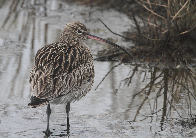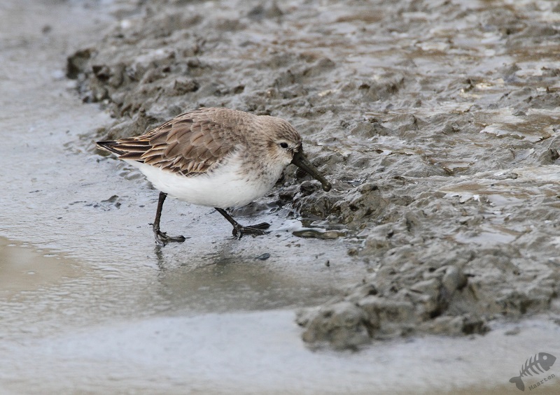 Eén van de soorten welke er gezien was, was het Bokje. Nog zo’n soort die ik heel graag eens zou zien. Langs de weg waarop ik reed, ligt een sloot en daar zouden ze kunnen zitten. Verderop stond een auto met een grote lens uit het raam: een fotograaf was bezig een Watersnipje te fotograferen. Ik wilde niet achterblijven en heb deze heel leuke soort ook vastgelegd. Toen ik verder gereden was, kwam ik de fotograaf weer tegen bij het veld waar vorig jaar de Blauwe Kiekendief zat. We raakten even aan de praat en het bleek een fotograaf uit Rotterdam te zijn die regelmatig naar dit gebied kwam. Hij wist te vertellen dat de Velduilen inderdaad niet geweest waren, dus heb ik me maar gestort op de Tureluurtjes die er wel volop zaten. Bij een smalle vaart, die nog gedeeltelijk open was, zaten nog meer Tureluurtjes maar ook Bonte Strandlopers. Heel even zag ik langs een “schicht” lopen: een Waterral kwam heel even uit z’n dekking! De foto’s stellen niks voor, maar ik heb hem wel gezien! Ik ben weer verder gegaan en kwam uit bij het terrein waar de Uilen zaten tussen de dijken in. Daar stond de fotograaf ook weer bij een sluisje en scharrelde weer een Watersnipje rond. Wat heel jammer was, was dat het juist in dit gedeelte behoorlijk mistig was. Dat maakte de foto’s niet mooier, ook niet van de Wulp die daar even ging zitten en de Bonte Strandloper, maar het was toch heel leuk om ze aan het werk te zien. Ik ben weer teruggereden naar de vaart en nu zwommen er ook nog Slobeenden. Ook deze vastgelegd en verder gegaan naar de eerder genoemde sloot. Daar stonden inmiddels meer fotografen maar zaten ook meer Watersnippen.