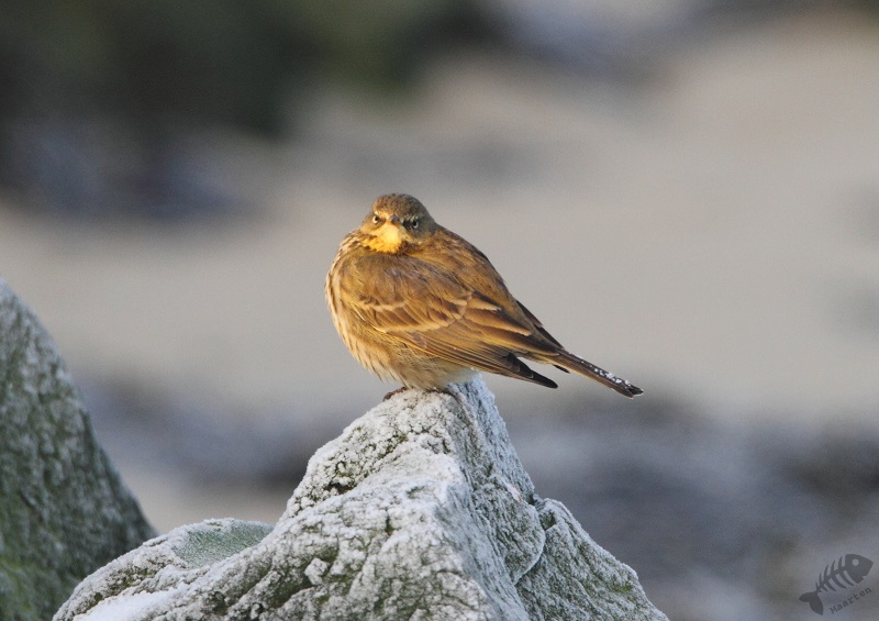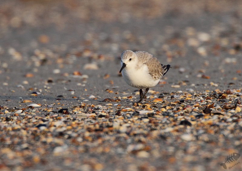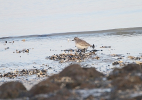 Toen ik op de Brouwersdam aankwam scheen de zon volop. Ik ben de ventweg afgereden en heb goed gekeken of ik iets zou zien. Op de basaltblokken zaten wat Scholeksters en er zwommen enkele Wilde Eenden. Ook zwommen er Rotganzen rond en liepen er op een halfrond strand aan het einde van de ventweg wat Strandlopers. Ik heb m’n auto daar neergezet en zag een Pieper niet ver van me vandaan zitten. Gezien de omgeving en hoe hij eruit zag, ga ik ervanuit dat het een Oeverpieper was. Ik ben naar het strand gelopen, maar wilde er zeker van zijn dat ik niks zou verstoren, de vogels hebben het toch al moeilijk genoeg, zodat alles op behoorlijke afstand bleef. Ik ben toen maar een berg basaltblokken overgeklommen en daar vond ik een Zilverplevier en een Drieteenstrandloper. De eerste kreeg ik weer niet mooi scherp op de foto (ik heb hem wel even moeten opzoeken: in oktober 2011 heb ik een soortgelijke vogel op de foto gezet. Toen heb ik hem als Goudplevier bestempeld. Wanneer ik de foto’s nu vergelijk vind ik de vogel van vandaag lichter op de borst wat zou moeten duiden op een Zilverplevier…). De tweede kwam steeds dichter naar me toe, dus daar werden de plaatjes heel redelijk van.