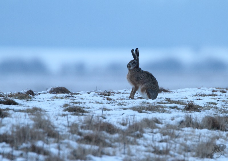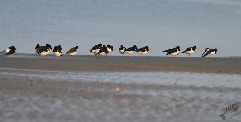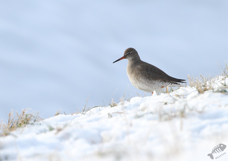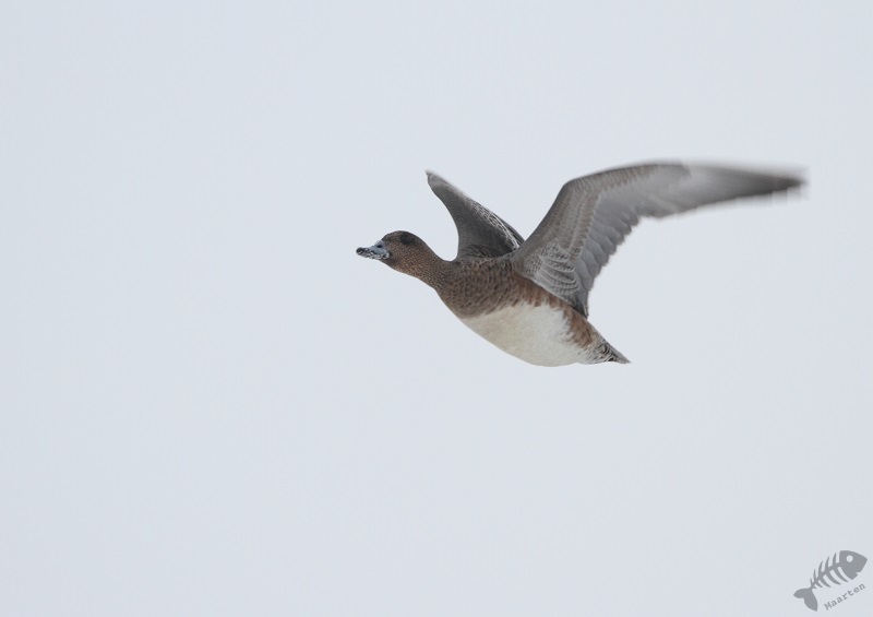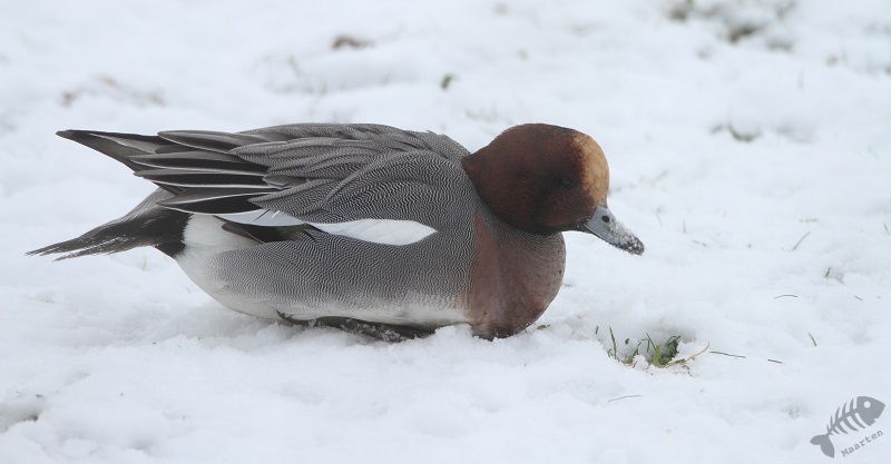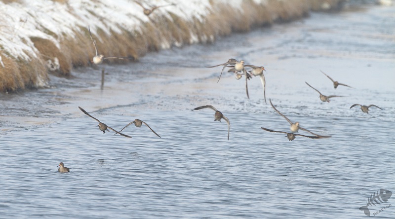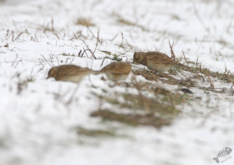 Het werd inmiddels ook donkerder en donkerder en al snel zou er te weinig licht. Ik ben dus snel nog een keer richting de Plompetoren gereden waar ik een groepje Veldleeuweriken trof. Tussen de sneeuw scharrelde ze rond op zoek naar voedsel. De vogels hebben het maar zwaar… Toen ik opkeek zak ik in de verte een grote vlucht Smienten rondvliegen. Ik had deze al eerder op de dag op de dijk waar ik stond gefotografeerd, maar nu vloog er een grote groep rond, samen met een groep Brandganzen.