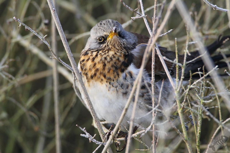 Ik ben doorgereden naar Serooskerke en kwam ook daar aan met prachtig weer. Direct toen ik de afslag genomen had, zag ik een Kramsvogel: een soort welke ik ook nog heel graag mooi wilde hebben. Het lukte me niet om hem te fotograferen, maar toen ik verder wilde gaan en nog even de andere kant opkeek, bleek ik naast een bessenstruik te staan met een kleine tiental Kramsvogels! Ik kon een hele serie maken met prachtig licht, dus opgetogen kon ik verder.