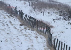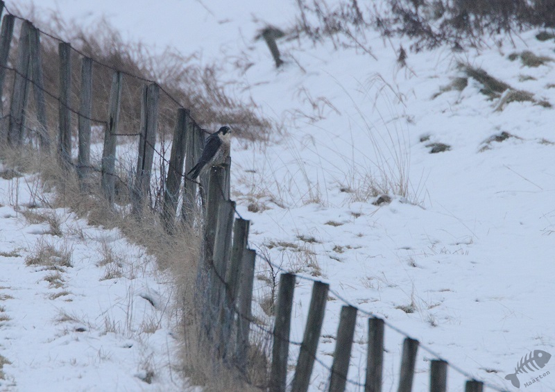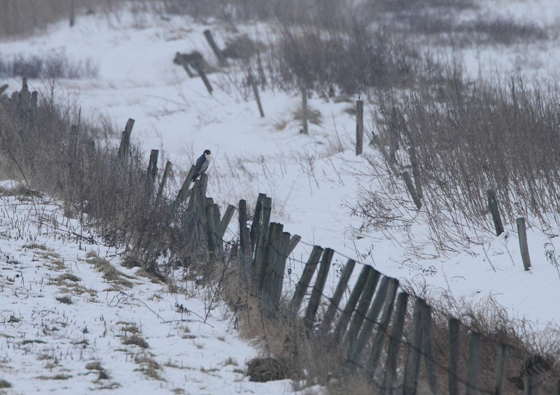 Al snel zag ik de reden: er vloog een Slechtvalk rond! Deze ging redelijk bij me in de buurt zitten (tenminste: helemaal achterin een veld op een prikkeldraadpaaltje van een rij paaltjes waar ik naast stond…). Ik weet niet helemaal zeker meer hoe het ging of waar hij vandaan kwam, maar niet veel later zat er een tweede Slechtvalk! Op de zelfde rij paaltjes, maar een ietsje dichterbij. Natuurlijk ook deze vastgelegd, met inderdaad steeds beroerder licht, en ook nog opnamen gemaakt van de 2 in 1 beeld.