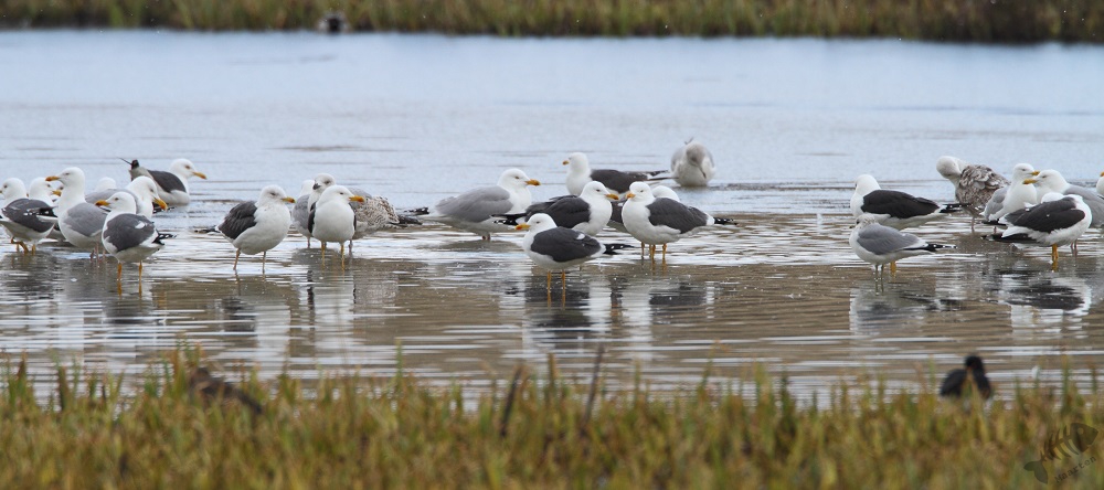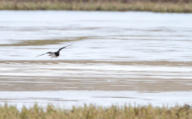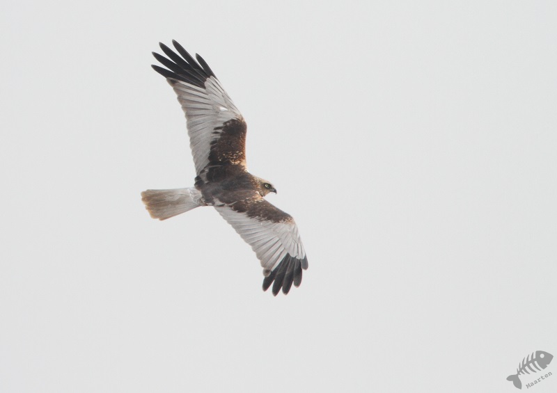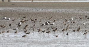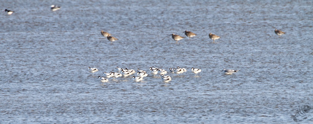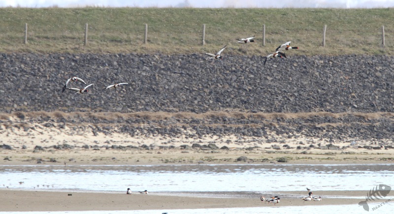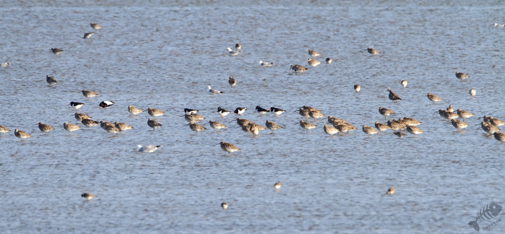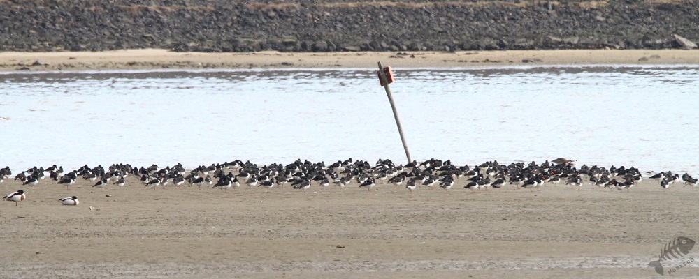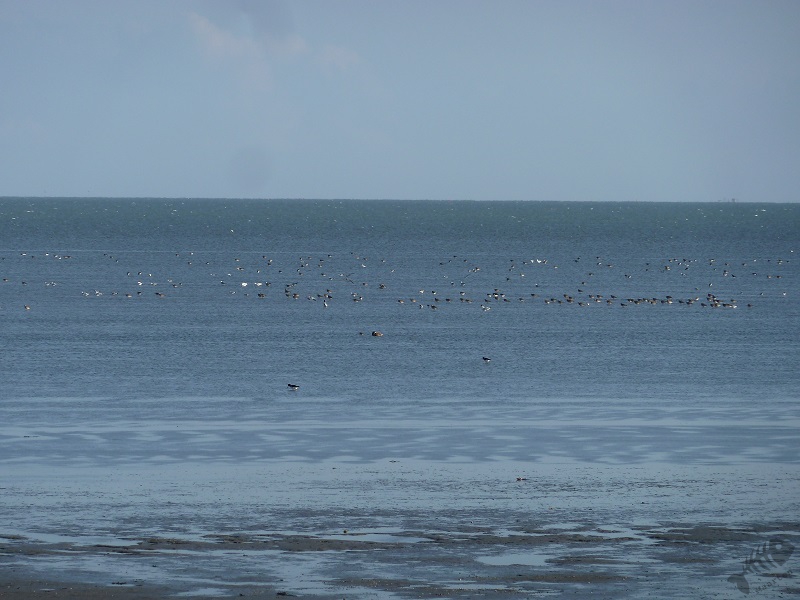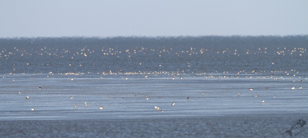 Er stonden grote groepen Wulpen, Scholeksters en Bergeenden die ook druk heen en weer vlogen. Terwijl ik bezig was foto’s van deze groepen te maken, vloog er een Bruine Kiekendief voorbij. Met de wind in de rug was deze veel te snel voorbij en hij vloog richting het Hoornder Nieuwland weg.