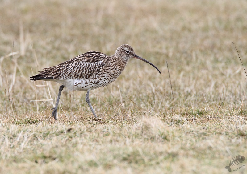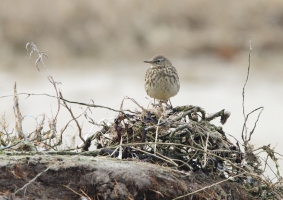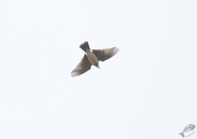 Al vrij snel zag ik in een kreek een Piepertje rondscharrelen. Het blijven erg lastige vogeltjes om te determineren en ik dacht misschien met een Oeverpieper te maken te hebben. Toen ik thuis de foto´s beter kon bekijken, heb ik er toch maar een Graspieper van gemaakt. Terwijl ik op de kant van de kreek zat en druk bezig was met de Pieper, keek ik even achterom en schrok ik goed wakker: een Bruine Kiekendief vloog op redelijke dichte afstand achter me langs! Snel alles omgezet en nog net wat plaatjes kunnen maken. Nadat deze Bruine Kiek richting de duinen was verdwenen vlogen er ook nog een Buizerd (heel ver weg) en een Grauwe Gans op kortere afstand voorbij. Er zaten ook heel wat Veldleeuweriken welke regelmatig opvlogen om hun prachtige zang te laten horen.