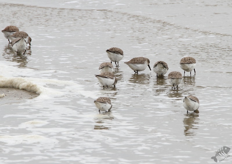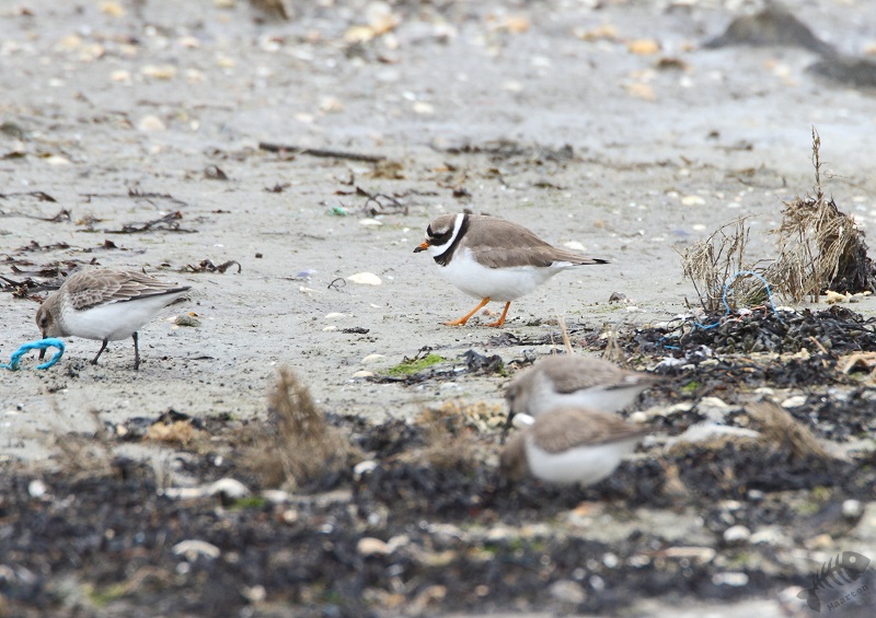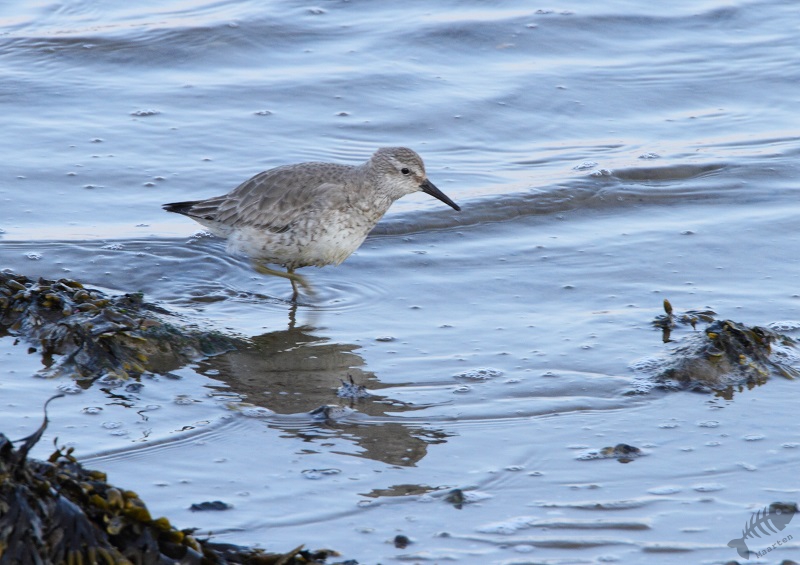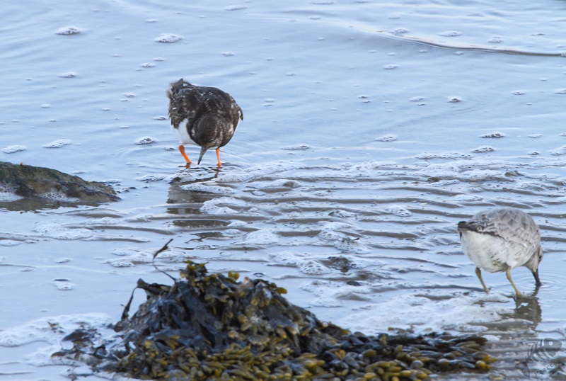 Nadat ik het einde van de dijk bereikt had, hier even rondgekeken had, ben ik weer teruggelopen. Weer bij de auto ben ik naar de Waddenkant gegaan, heb mezelf vastklampend tegen de wind over de dijk getrokken, en na iets van de bovenkant af te zijn gedaald, kon ik zien dat er ook hier van alles rondliep en aan het foerageren was. Al snel zag ik een Steenloper met in zijn buurt weer een Kanoet! Ook het Bontbekje zat hier weer en een groep Kluten verderop in het water.