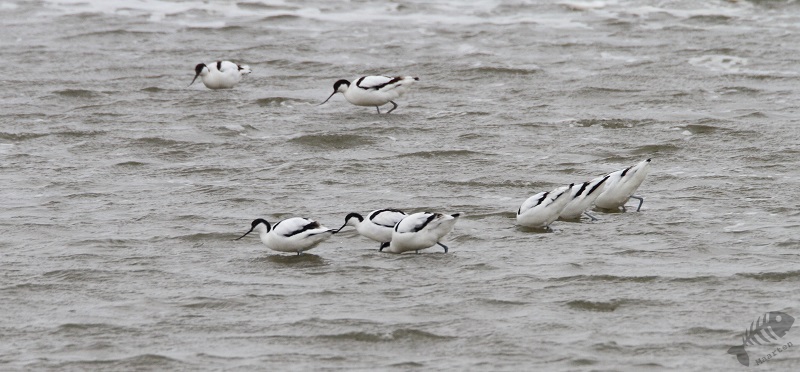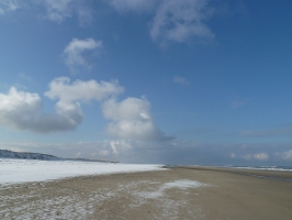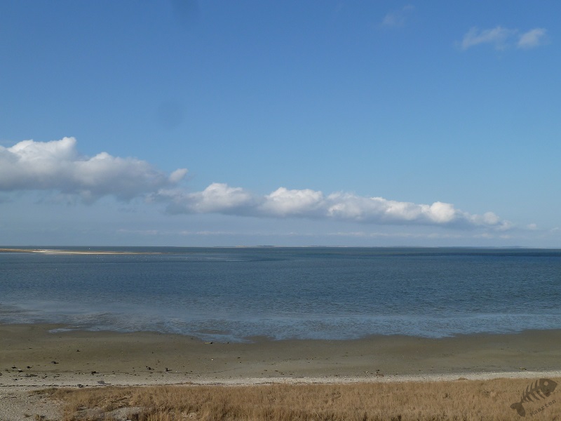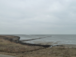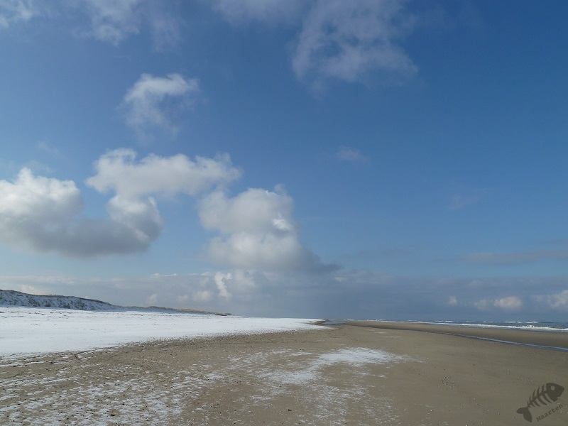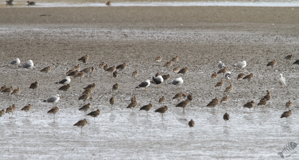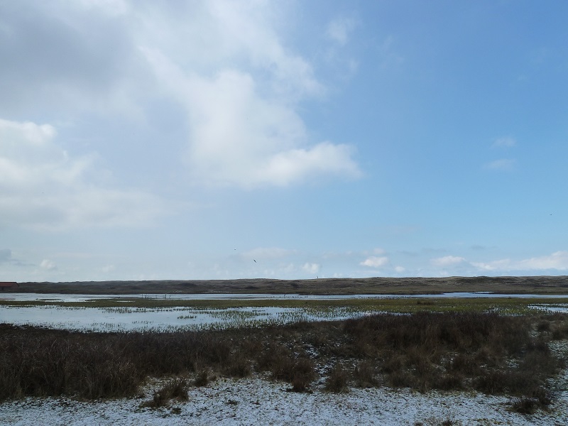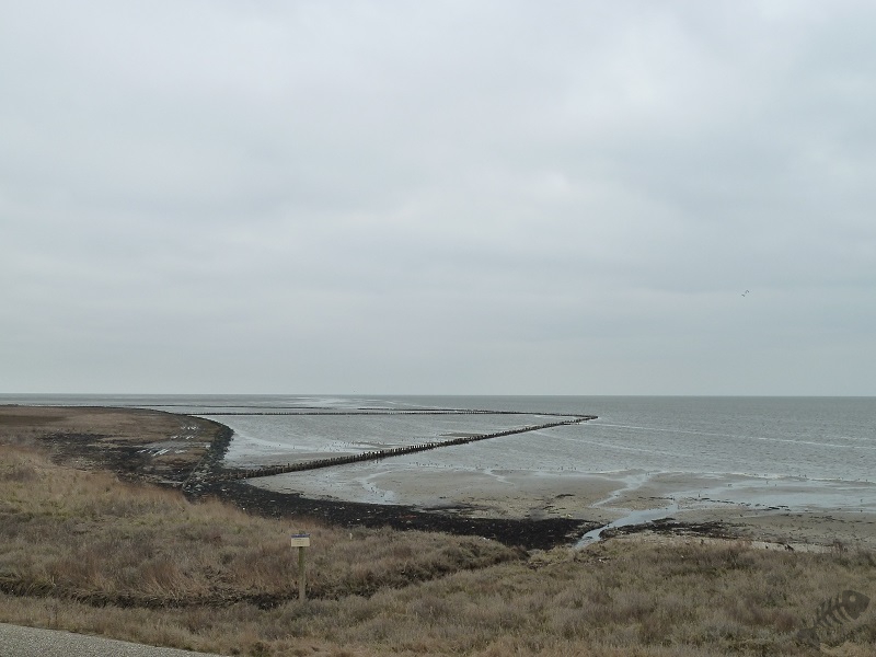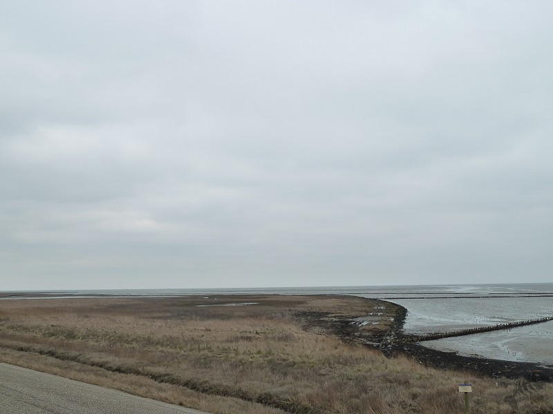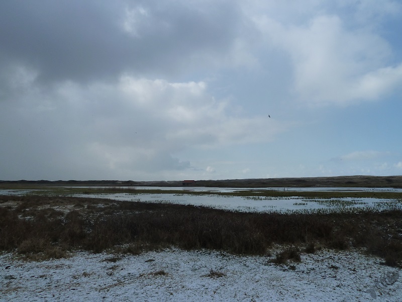 De laatste dag dat ik erop uit kon gaan. Het weer leek prima, de zon scheen, helaas waaide het nog wel vreselijk hard. Vandaag had ik wat meer tijd en wilde ik naar het zuiden gaan: in ieder geval naar de Mokbaai en daarna zou ik wel zien. Naarmate ik dichter in de buurt van de baai kwam, werd het steeds donkerder en toen ik er was begon het te sneeuwen… Ook was het laag water waardoor de vogels verder van de weg afbleven en dus minder duidelijk te zien waren.