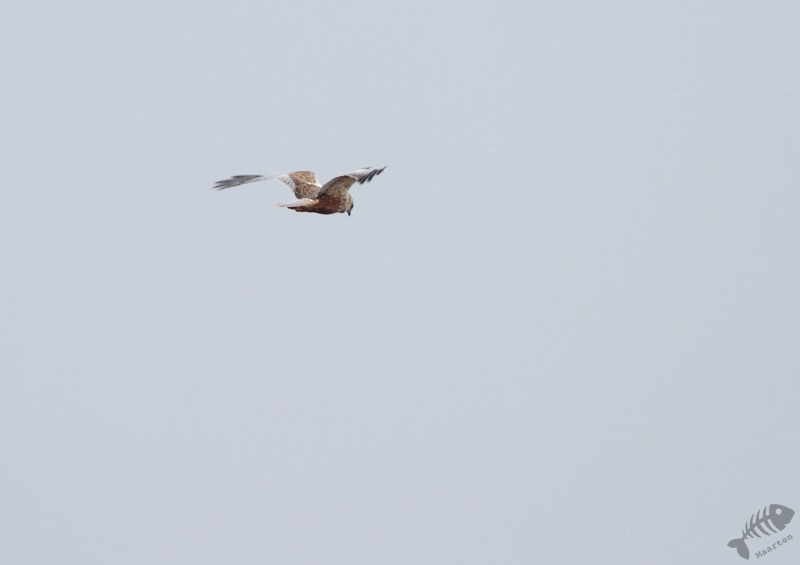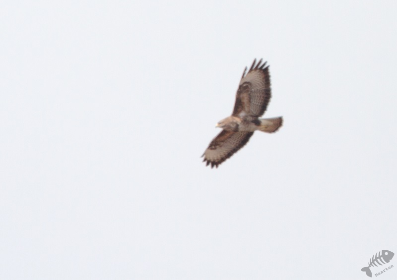 Toen de vogeltjes verder gevlogen waren, ben ik verder gereden naar het begin van het andere pad en ben daar gaan wandelen. Het weer knapte op (behalve de wind en de temperatuur) maar heel veel vogels heb ik niet meer gezien of gehoord. Alleen een Buizerd vloog over het gebied en leek hoogte te winnen om misschien te gaan trekken, Verder vloog er een Torenvalkje heel ver weg. Ik had een tijdje de hoop dat hij dichterbij zou komen, maar helaas…