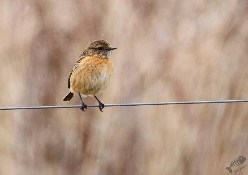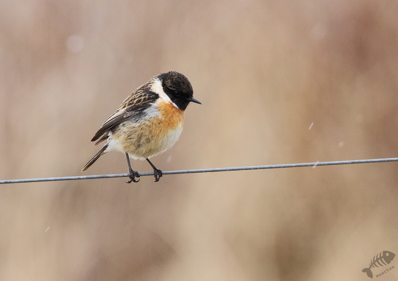 Ik twijfelde of ik nog een stukje zou gaan lopen naar de Horsmeertjes, maar heb dat vanwege de sneeuw toch maar niet gedaan. Ik had gezien dat iets ten noordwesten van Den Hoorn ook interessante gebieden lagen en ben daar dus heengereden. Toen ik bij het begin van een wandelpad aankwam, vloog ook hier een Bruine Kiekendief rond. Deze lukte me wel op de foto te krijgen en vol goede moed ben ik gaan wandelen de Bolle Kamer in richting Pieter Rozenvlak. Vrij aan het begin van het pad liep ik langs een water waar verschillende soorten Meeuwen stonden: Kleine Mantelmeeuwen en Zilvermeeuwen. Na een stukje lopen leek het alsof het pad niet veel meer zou bieden en ik ben teruggelopen naar de auto om iets terug te rijden en daar het zelfde gebied in te gaan. Ik was bijna bij het pad toen ik een paartje Roodborsttapuitjes zag zitten. Ik heb snel de auto neergezet en het lukte me, eigenlijk voor het eerst (!), ze mooi te fotograferen van een heel redelijke afstand! Wat wel aardig is, is dat op een aantal foto’s je kunt zien dat het sneeuwt…