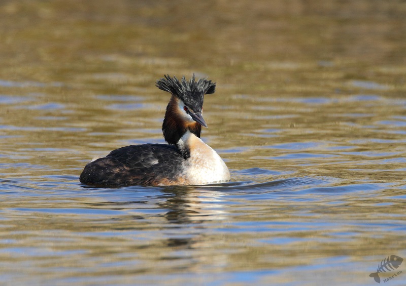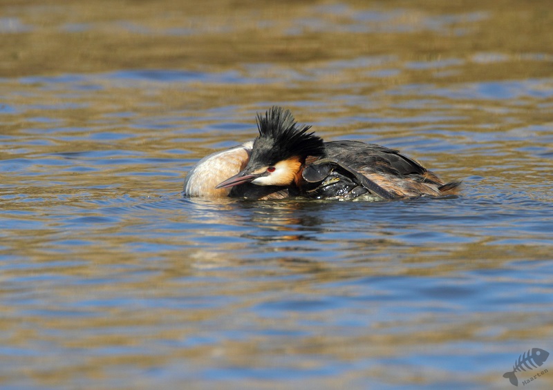 Verder was het rustig in de polder. Ik kwam ook nog een wat boos kijkend Tureluurtje tegen, maar daar bleef het bij in dit deel. Ik ben toen naar de andere kant gereden om langs de vaart weer richting huis te gaan. In de vaart zwom nog een Fuut waar ik graag voor wilde stoppen. Hij zette zijn kruinveren mooi op en op een gegeven moment begon hij zich te poetsen waarbij zijn gelobde poten mooi te zien waren.