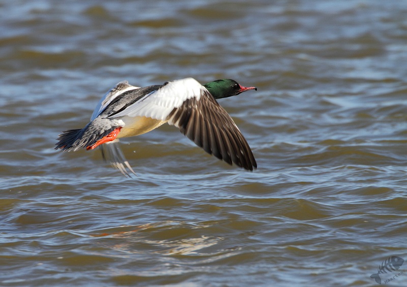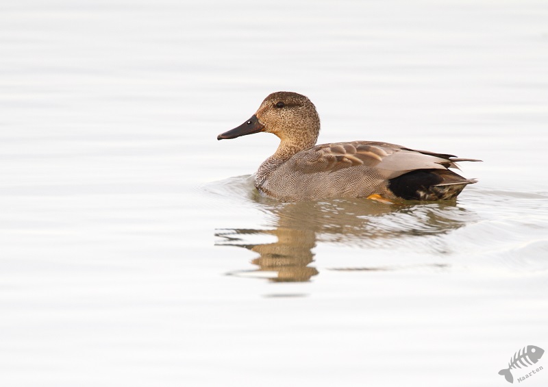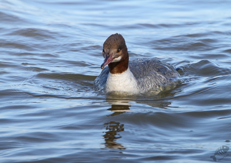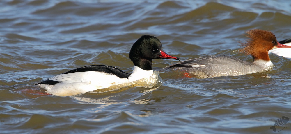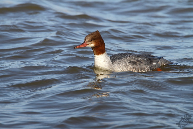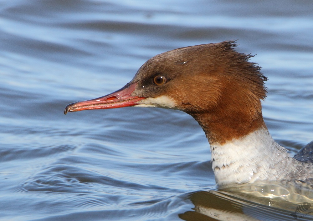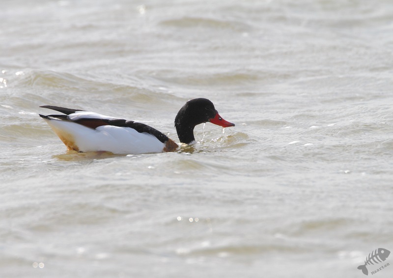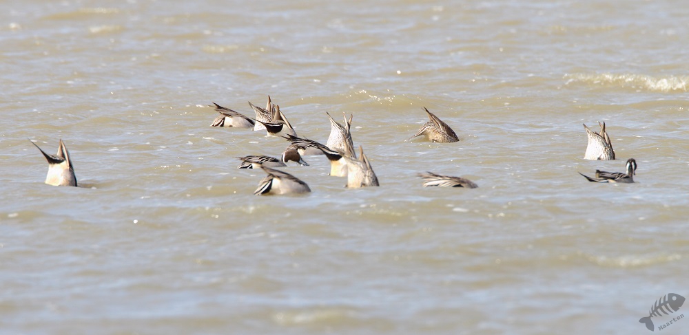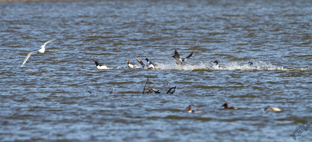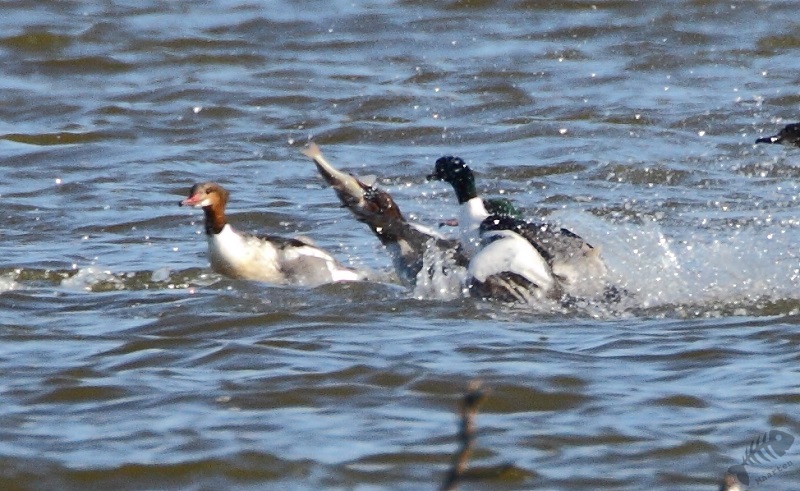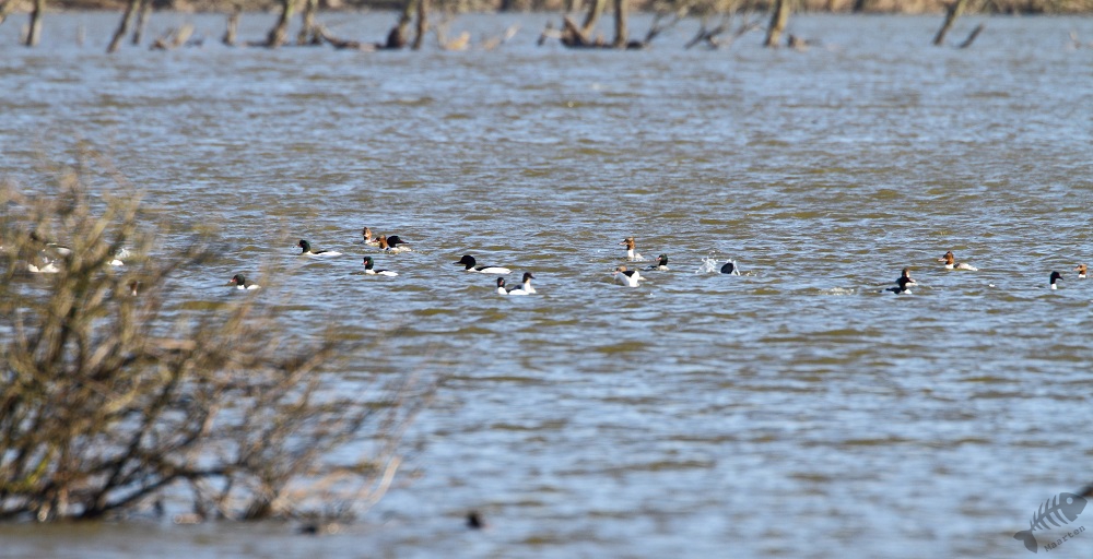 Rechts van de hut zag ik een grote groep Eenden zwemmen welke langzaam naar links zwom. Het was een groep van zo’n 30 Grote Zaagbekken! Toen ze tegenover me zwommen was er ineens een hoop onrust: één van de dames had een grote vis gevangen en de rest wilde die wel van dichterbij bekijken. Ik geloof dat ze hem uiteindelijk zelf heeft kunnen opeten.