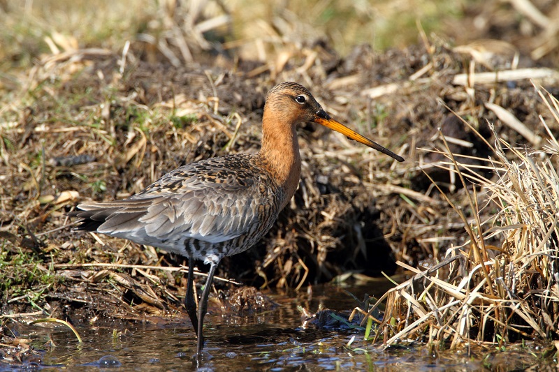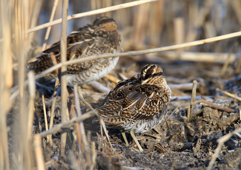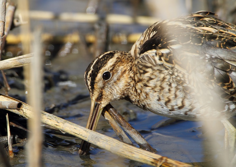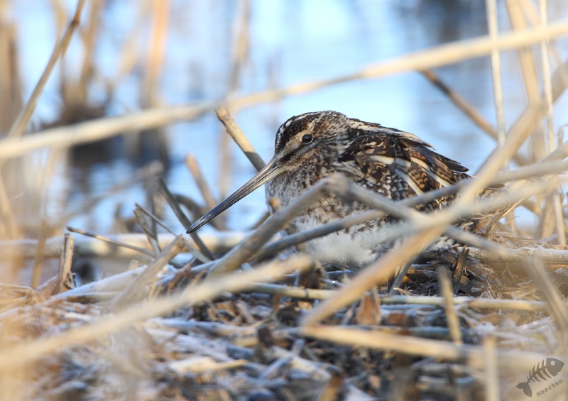 Rond 8 uur kwam ik aan en ben direct naar de hut aan de Keersluisplas gelopen. Vorig jaar zat daar een koppeltje Blauwborstjes, dus waarom nu niet? Ik denk dat de mannetjes het wel mooi vonden met die wind en niet de moeite wilden nemen mooi bovenin het riet te gaan zingen. Ze lieten zich niet zien en nauwelijks horen. Toen ik de grond voor de hut afzocht, zag ik tot m’n plezier wel een paar andere oude bekenden: er scharrelde enkele Watersnippen rond. Ik heb me daar maar op geconcentreerd en van een actieve Snip een filmpje gemaakt.