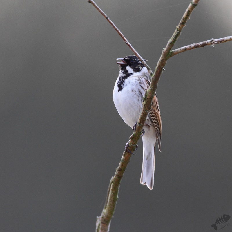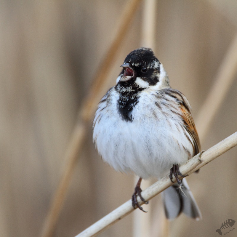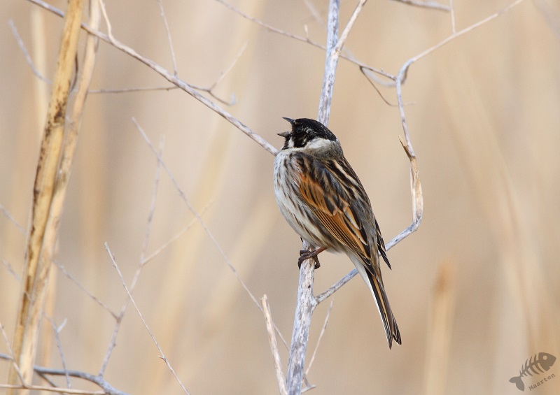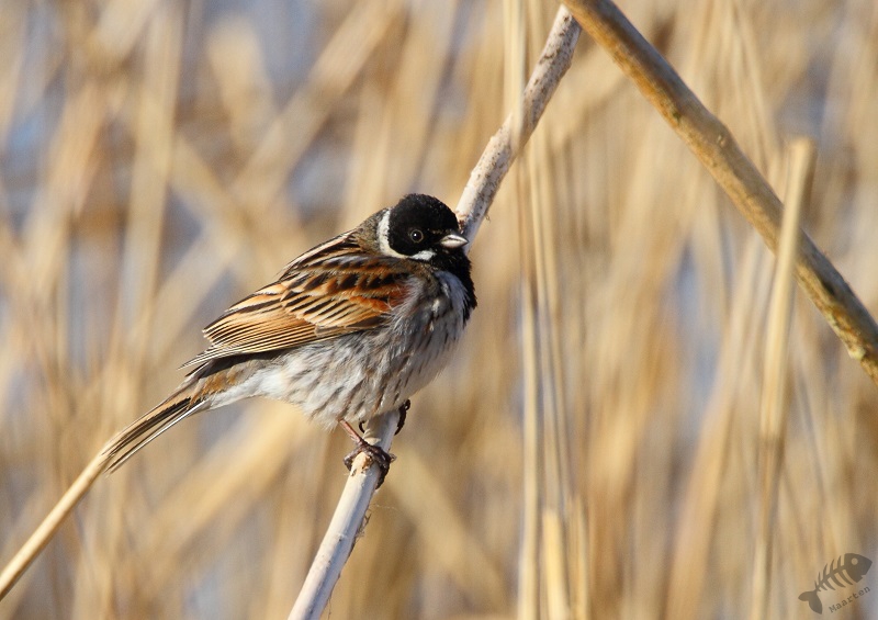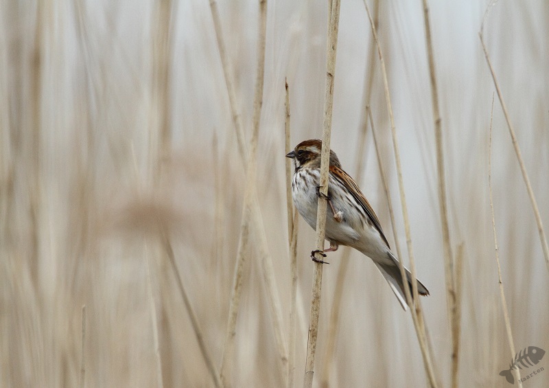 Daarna ben ik doorgelopen richting de Schollevaar. In het rietveld waar je als eerste langskomt, zat toch een Blauwborstje te zingen. Helemaal verscholen onderin het Riet. Ik heb een tijdje aangekeken of hij naar boven zou komen, maar hij maakte geen aanstalten. Na de 1ste 5(!) foto’s van de Blauwborst dit jaar, ben ik verder gegaan. Een Rietgors mannetje had blijkbaar ook last van de wind: hij ging iets vrijer zitten, maar hield zich wel als kleine pluizenbol.