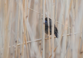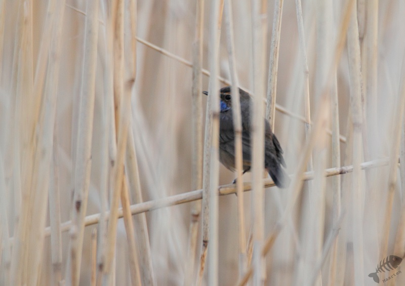 Dat deed het niet. Weer was ik er rond half 7, en weer waaide het hard. Maar: eindelijk leek de Blauwborst zich er niet teveel van aan te trekken. Niet dat hij zich de hele tijd bovenin de riethalmen bevond, maar met vlagen, verspreid over de dag, deed hij het wel. Eindelijk heb ik vandaag dus de foto’s kunnen maken waar ik deze dagen op gehoopt had en heb ik een filmpje kunnen maken (waarop de wind ook duidelijk aanwezig is). Vanuit de hut aan de Keesluisplas heb ik hem eindelijk ook weer eens gezien en kon ik bijna een portret van hem maken, totdat een aantal mensen binnenkwam die niet direct in de gaten hadden dat het om een vogelkijkhut gaat…