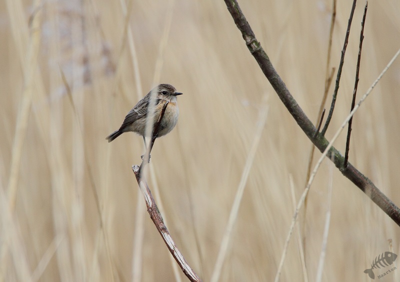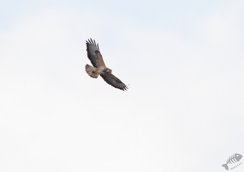 Ik ben weer richting de Schollevaar gelopen en zag onderweg Tjiftjafjes, het leek wel schuilend voor de wind, onderin het Riet scharrelen. Aan het einde van het pad zat weer een Roodborsttapuit, een vrouwtje deze keer en vloog er een Bruine Kiekendief rond. Vanuit de hut zag ik weer een Aalscholver en Grote Zaagbekken. Er vlogen ook Grauwe Ganzen over en een Grote Zilverreiger. Maar ook hier was het eigenlijk rustig en waaide ik bijna de hut uit door de luiken…