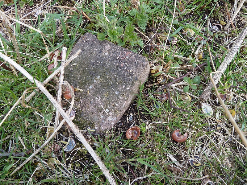 Ik ben ook weer naar de Schollevaar gelopen en hoorde regelmatig Baardmannetjes in de uitgebreide rietkragen. Toen er eentje dichterbij dreigde te komen, wilde een “natuurfotograaf” (tussen aanhalingstekens want hij vond het gepast geluiden te gebruiken om vogels te lokken) weten wat ik op het oog had. Dat ging met aardig wat geluid en gebaar, waardoor de Baardman het voor gezien hield. Uiteindelijk zag ik er eentje op het kleinere pad terug van de Schollevaar en wist hem nog vast te leggen ook! Het werd een mooi plaatje “Wie kijkt naar wie?” Bij een struik langs het water vond ik een steen met een boel kapotte slakkenhuizen eromheen. Ik kende het, maar het nog nooit eerder een “aambeeld” van een Zanglijster gezien. Weer een primeur!