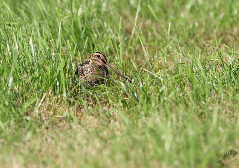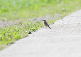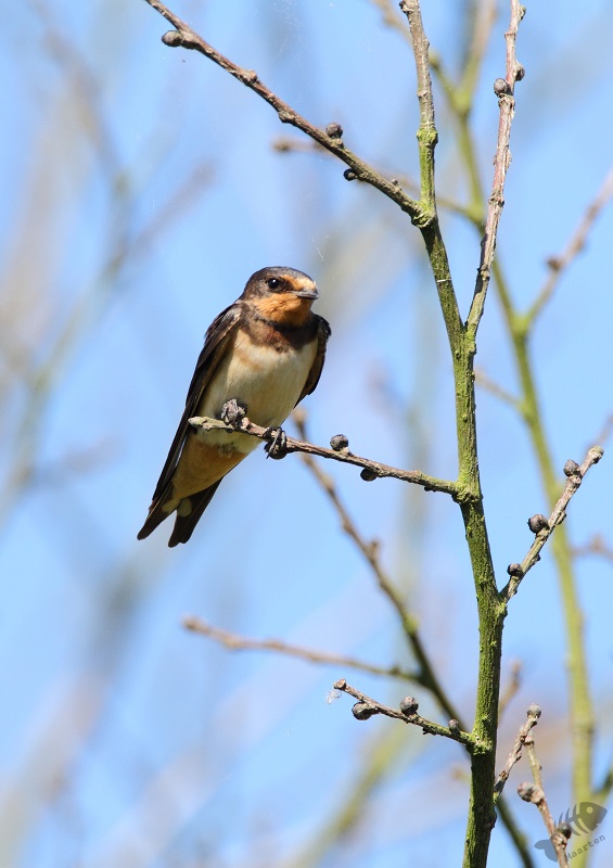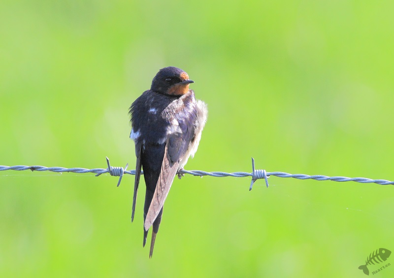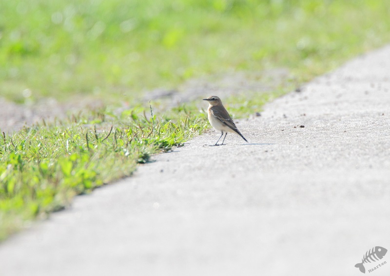 Wat later in de ochtend was ik in de polder. Ik had bedacht maar niet het “verboden gebied” in te gaan, maar gewoon rechtsaf bij de rotonde. Dat bleek een heel goede keuze! Toen ik het weggetje richting de snelweg afreed, zat er al één van de soorten waarop ik gehoopt had: een Tapuit! Toen het me gelukt was, al in bochten wringend, hem vast te leggen zag ik vanuit een ooghoek op een paaltje aan de andere kant van het weggetje ook iets zitten. Toen ik daar, letterlijk, op gefocust had bleek het een Paapje te zijn! Zo had ik 2 van mijn wenssoorten direct bij elkaar! Nu al kon mijn dag niet meer stuk. Toch ben ik nog wat verder gaan rondtoeren en zag iets verderop een Ringmus zitten. Nog zo’n soort die eigenlijk nooit gaat vervelen. Toen ik het rondje voor een 2de keer aan het rijden was en wat beter in één van de weilanden keek, stak er ineens een koppie van een Watersnip boven het gras uit. Het moest niet gekker worden! Toen ik ook deze vastgelegd had, kon ik het niet laten ook nog een foto van een Boerenzwaluw op een draad te maken. Eigenlijk kun je de polder niet verlaten zonder deze foto te maken…