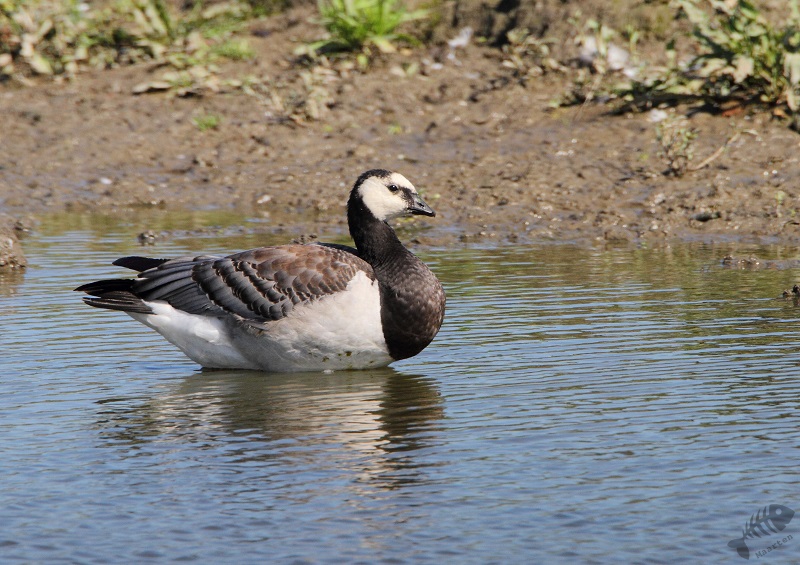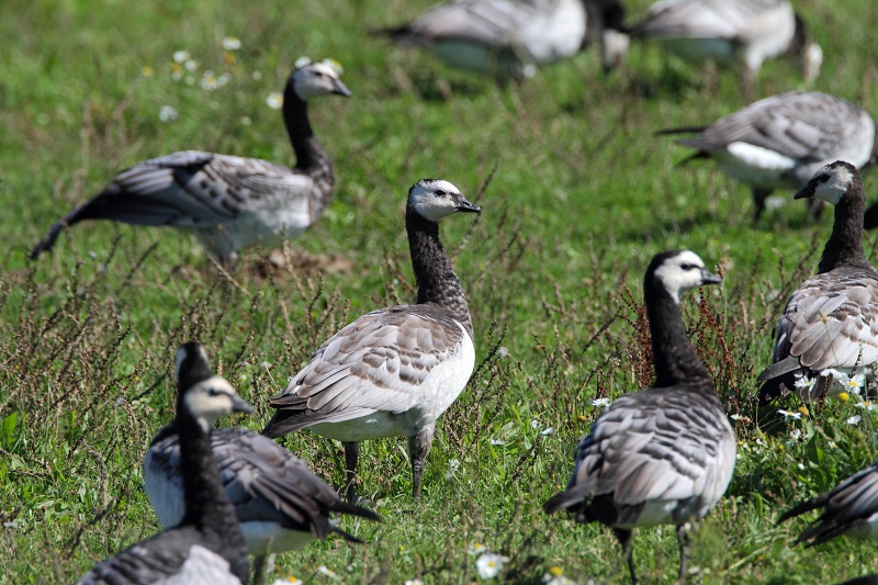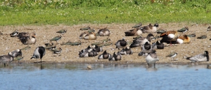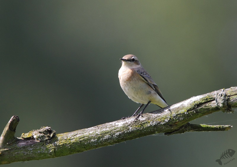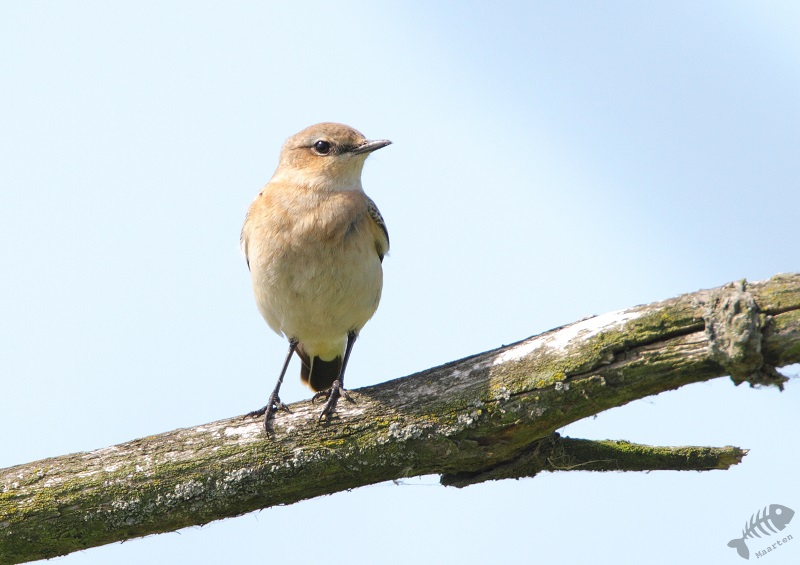 Toen ik binnen was, bleken er met name Ganzen te zien te zijn en dan met name Brandganzen. Aan de overkant van de plas zaten nog wel wat meer soorten en hiervan heb ik een overzichtsplaatje gemaakt. Dit keer waren er geen Reeën of IJsvogeltjes te zien, dus ben ik vrij snel weer naar de auto gelopen en ben doorgereden naar het bezoekerscentrum. Ik had bedacht het rondje weer eens tegen de klok in te maken en eerst langs de vaart op richting de Zeearend te gaan. Halverwege kun je dan het “Wilgenbos” in en dat heb ik gedaan. Al vrij snel zag ik een vogeltje op een kale tak zitten. Dit bleek een Tapuit te zijn waardoor ik zomaar nummer 2 voor vandaag te pakken had. Deze kon ik zelfs redelijk benaderen en zo kon ik uit verschillende hoeken (en dus met verschillend lichtinval) foto’s van hem maken. Het licht was vandaag trouwens erg aanwezig. Het was erg hard waardoor fotograferen best lastig werd.