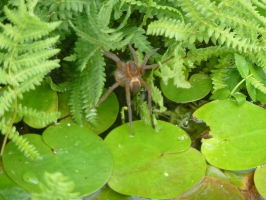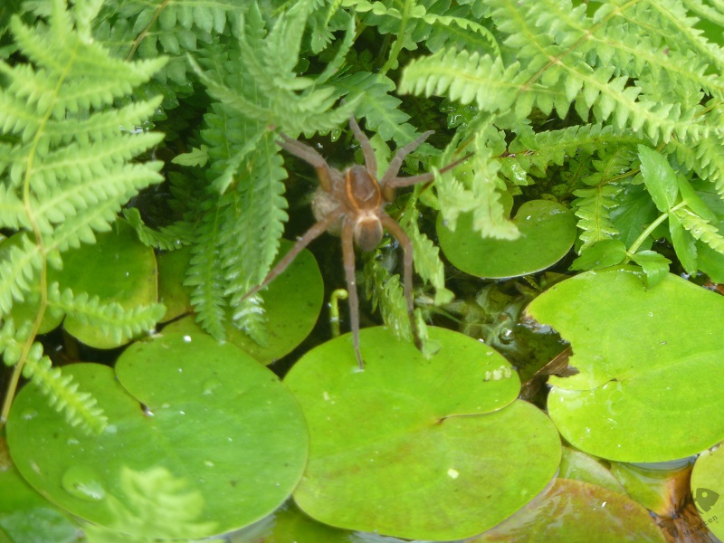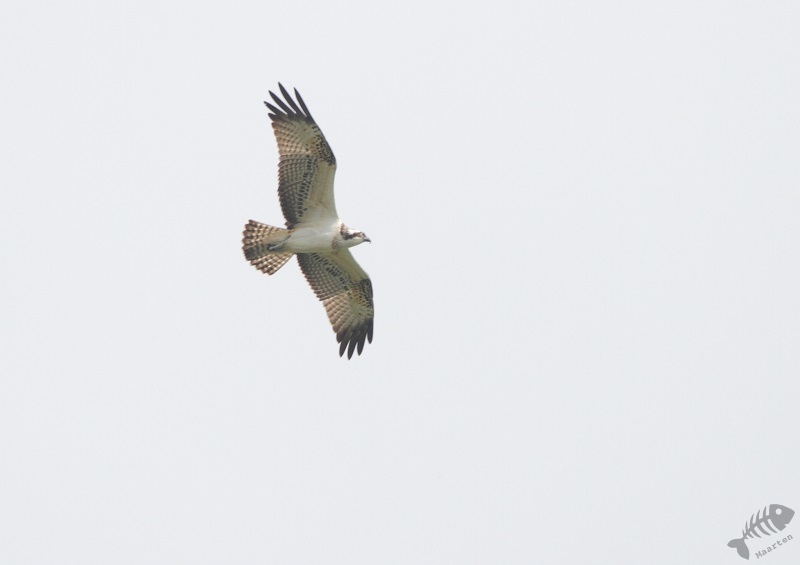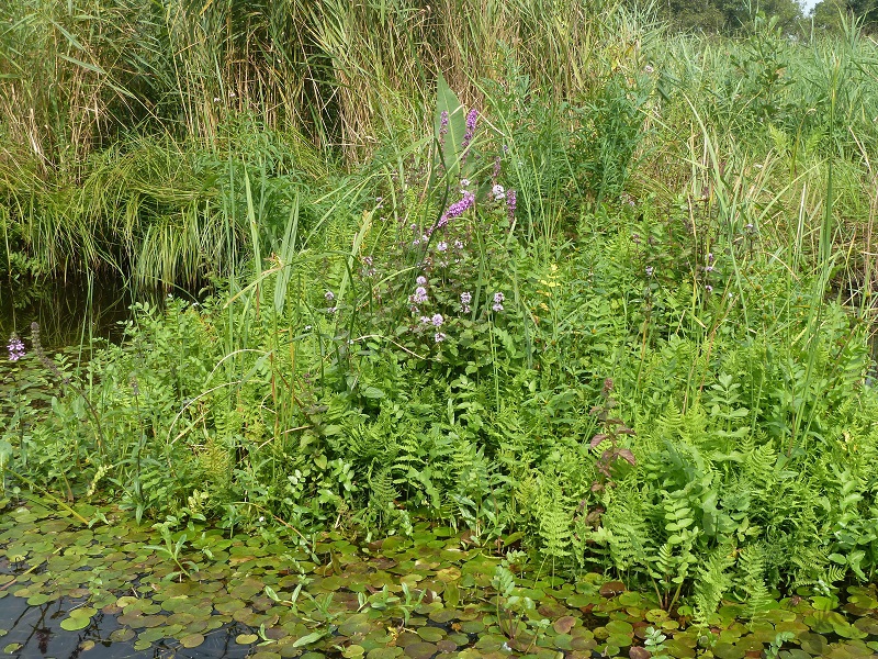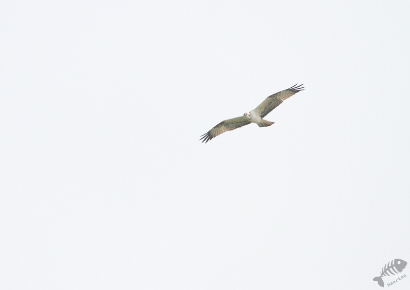 Op het laatste stukje voor de Venemaat kreeg ik ook nog een traktatie. Een soort, waar we stiekem de hele dag al een beetje op gerekend hadden, kwam vrij laag overvliegen. Het was een Visarend die helaas niet hongerig genoeg leek om vlak voor ons een vis te gaan vangen, maar het was wel een prachtig beeld. Omdat we stilhielden om de Arend goed te bekijken, viel het leven op de kant ook even goed op. Het bleek dat we vlak naast een redelijk imposante spin waren gaan liggen wat een Gerande Oeverspin bleek te zijn. Op de Venemaat hebben we in het Riet aangemeerd en hebben we even gerelaxt. Achter een tegenoverliggend stuk Riet, hoorden we wel wat vogels, maar toen we probeerden deze in beeld te krijgen vonden we niets. Langzaamaan zijn we weer richting Belt-Schutsloot gevaren. Helaas bleek er nergens meer een reden om te stoppen en waren we vlot weer bij de Waterlelie. Omdat de dame uit het bezoekerscentrum ook had aangegeven dat er sporen van Otters waren gezien onder een viaduct van de N334, zijn we daar ook nog heengereden. Ook hier vonden wel wat sporen maar was het niet helemaal duidelijk. De plek was er wel zeer geschikt voor zoals bleek uit een aflevering van Vroege Vogels.
