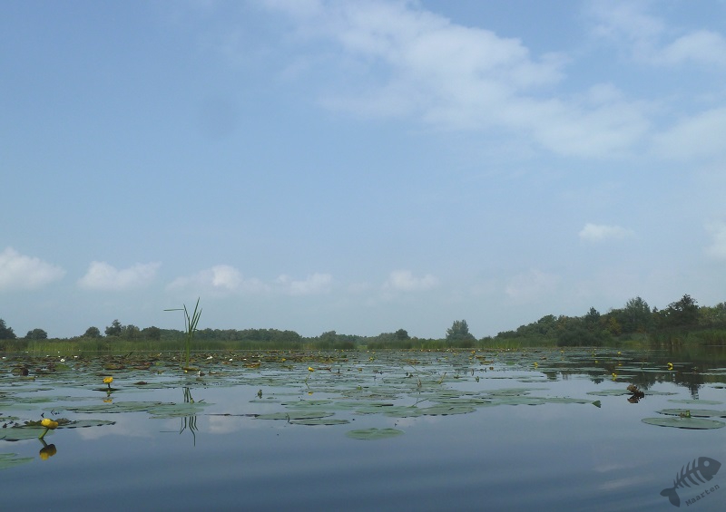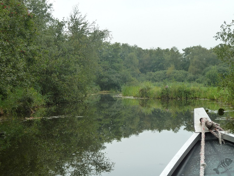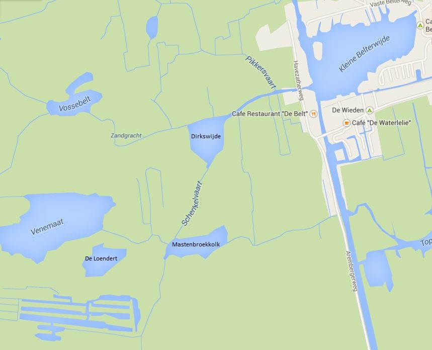 We zijn naar Belt-Schutsloot gegaan en na even zoeken vonden we het Café de Waterlelie waar we een fluisterbootje konden huren. Aangezien ik eventueel foto’s wilde maken onderweg en Arie zeer bedreven bleek in het varen, kroop hij achter het stuur en ik op het voorplecht en zijn we gaan varen. Allereerst voeren we de Kleine Belterwijde op om vrijwel direct links af te gaan richting Dirkswijde.