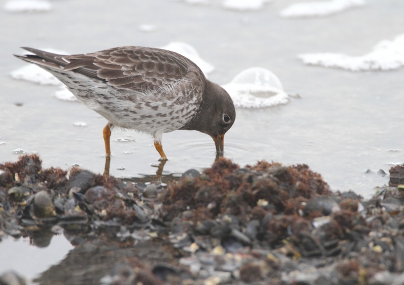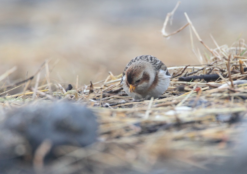 Omdat het nog net licht genoeg was en er ook nog een beetje tijd over was, hebben we weer een stop op de Brouwersdam gemaakt. Er bleken Paarse Strandlopers rond te lopen die ik ook nog niet eerder gezien had en zo kon ik de derde nieuwe soort van de dag optekenen! Het licht werd al wat minder, dus fotograferen lastig, maar het lukte me toch aardige opnamen te maken. Toen we weer bij de Haven kwamen, vond ik nog één vogeltje die de dag compleet maakte: een groepje Sneeuwgorzen zat op de rand van het strand en leken steeds dichterbij te komen. Helaas liep er ook net een stelletje die kant op, waardoor ze net voor m’n neus weer vertrokken… Uiteindelijk heb ik nog één aardige foto van deze prachtige soort kunnen maken.