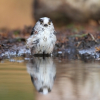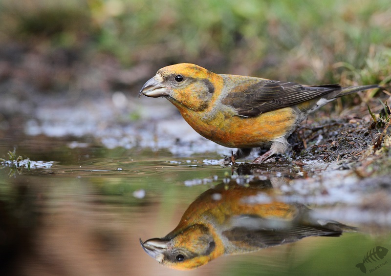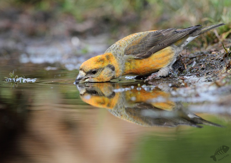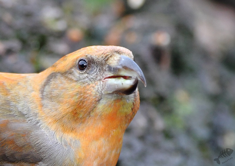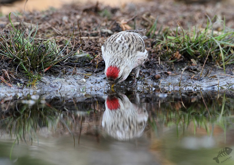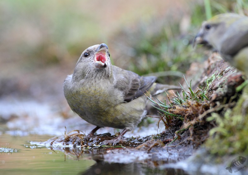 Om 8 uur zat ik helemaal klaar en kon het grote wachten weer beginnen. Na een kwartiertje verschenen de eerste vogels al: een Merel en een Vink. Na wat foto’s van deze 2 soorten gemaakt te hebben, verscheen er een, voor mij bij deze hut, nieuwe soort. Een groepje Staartmeesjes had ik al horen roepen rond de hut, maar nu landden ze vlak voor me en werd er lustig gebadderd! Terwijl de Staartmeesjes zo bezig waren, kwamen er ook een paar Sijsjes langs. De verdere dag zijn zij nog een paar keer gekomen en ik heb ze verschillende keren mooi kunnen vastleggen. Terwijl er een Heggenmus in het februarizonnetje zat, hoorde ik weer een bekend geluid, wat ik mij nog herinnerde van augustus. De Kruisbekken zaten weer in de buurt en ik hoopte van harte dat ze misschien weer even zouden komen zitten. En dat deden ze! Al ruziemakend kwam en een groep drinken. Eerst een paar vrouwtjes en een klein half uur daarna gevolgd door een mannetje.