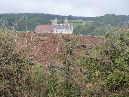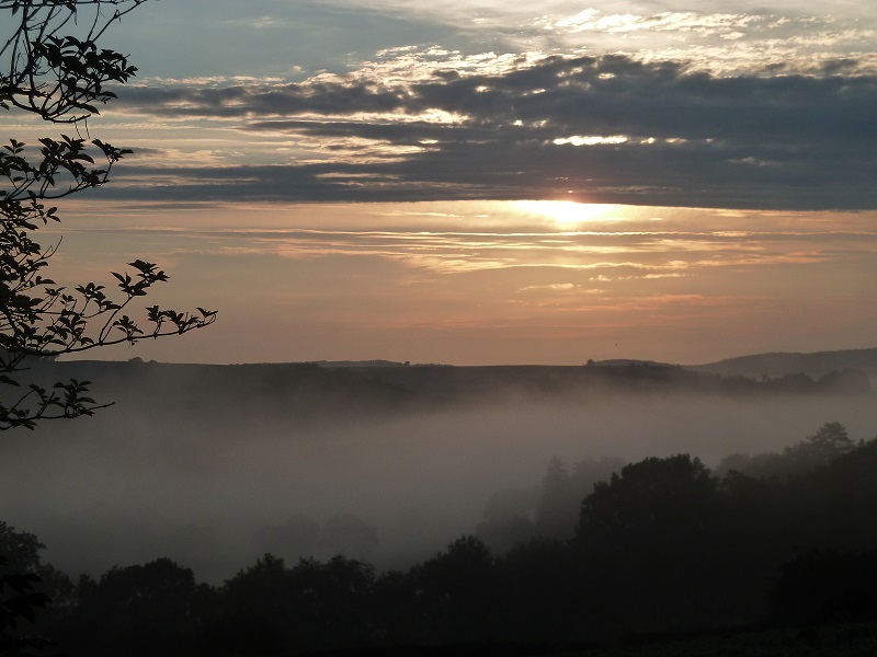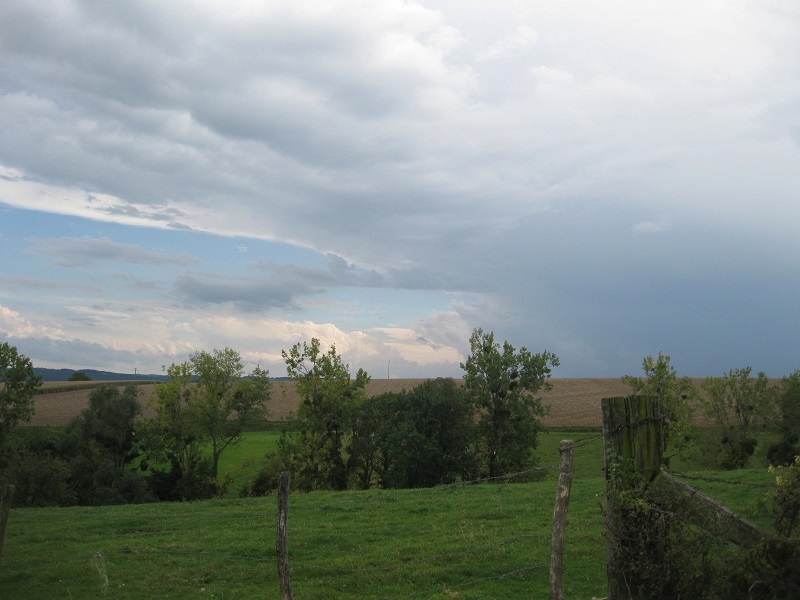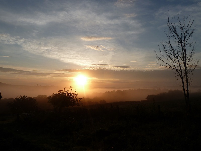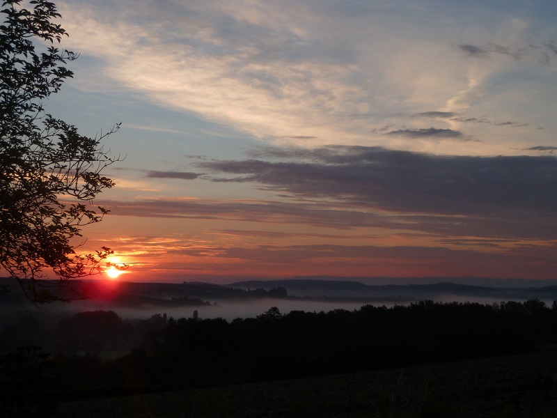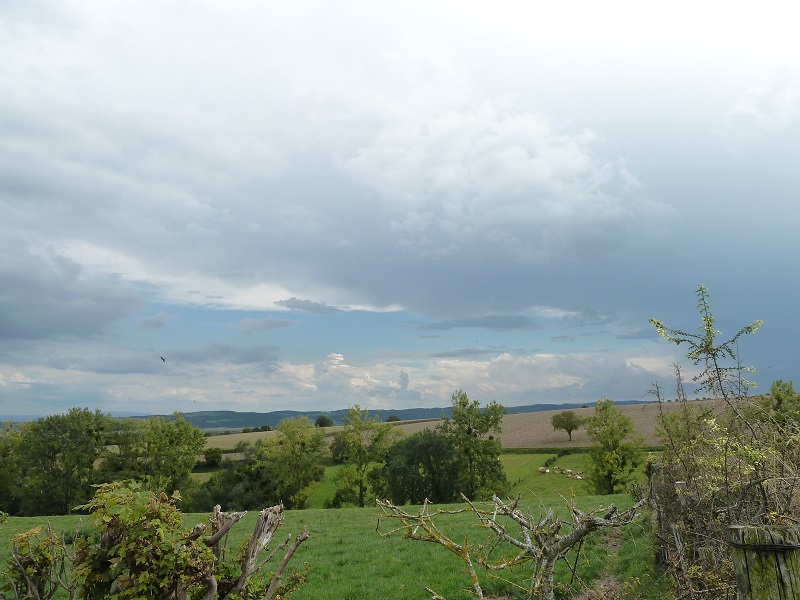 Bij aankomst bleek de camping te liggen op een heuvel met uitzicht over een bebost dal met aan de overkant een groot, enigszins vervallen, kasteel. De gebouwen op de camping zelf waren van een oude, voormalige boerderij: 2 stallen met nu verschillende andere functies, het oude woonhuis verbouwd tot 2 Gites, waarvan wij degene met terras hadden en aan de overkant van het erf hadden de eigenaren hun nieuwe woonhuis. De Kippen liepen vrij over het terrein, net als drie Eenden en een paar schaapjes stonden in een weiland. Overal vlogen Zwaluwen, Huis- en Boeren- en nadat ik gedacht had dat er wel eens Zwarte Roodstaarten zouden moeten kunnen zitten, hoorde ik er ééntje en vloog er een andere voorbij. Ik had direct het idee dat we ons hier wel 2 weekjes zouden moeten kunnen vermaken!