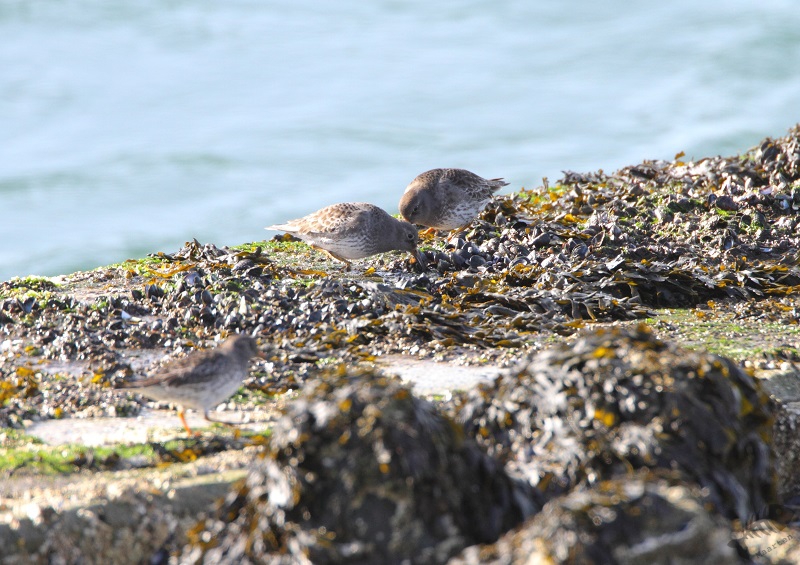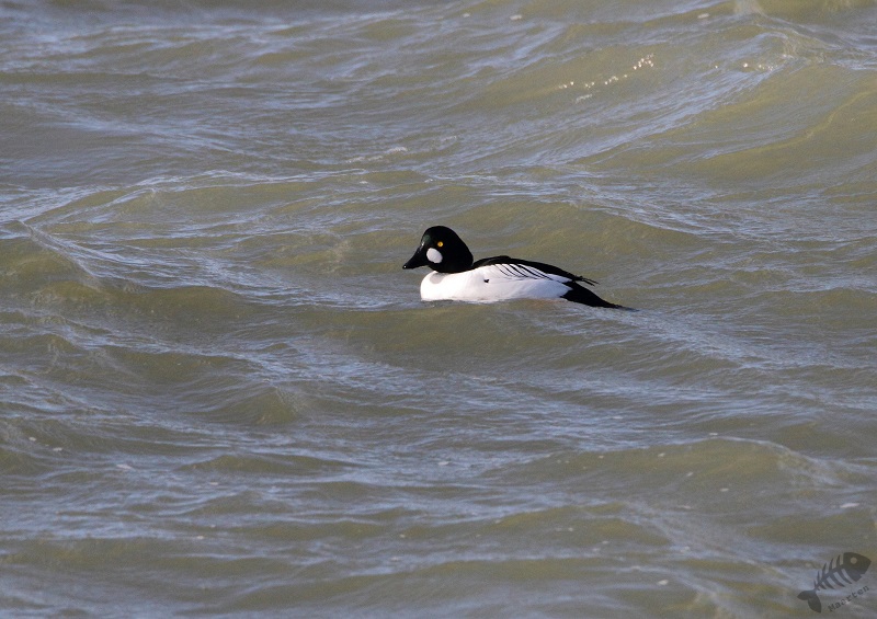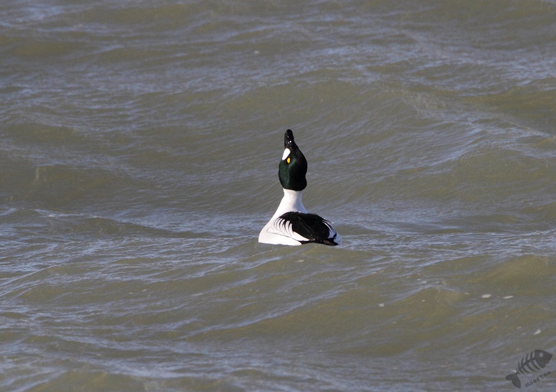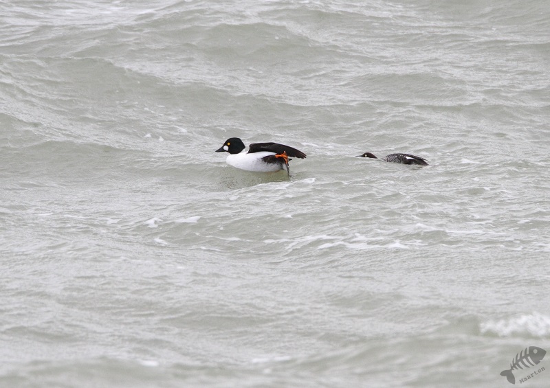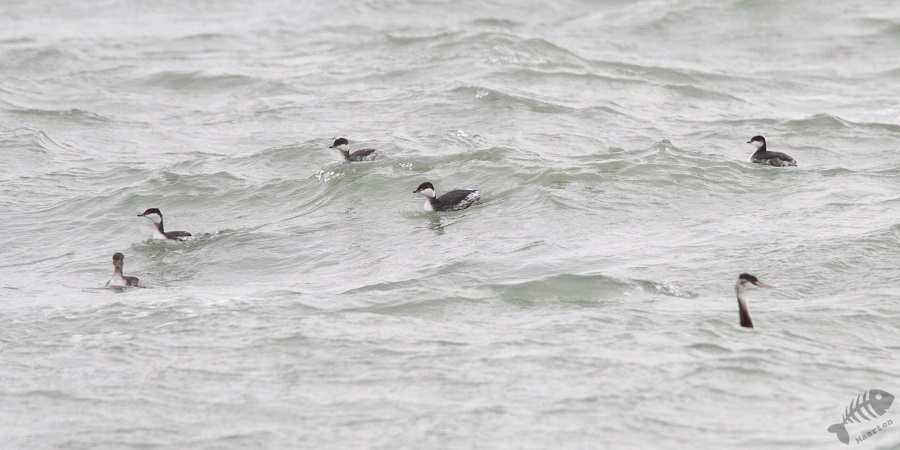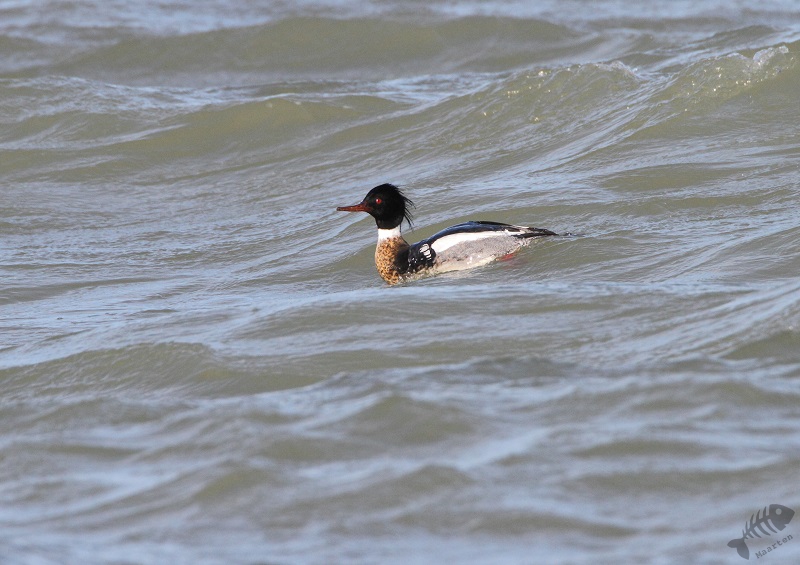 Toen we niet meer zagen, hebben we langzaam de terugreis weer begonnen, waarbij we weer via Brouwersdam zijn gereden. De zon scheen hier ook volop en met name de Brilduikers kwamen daardoor prachtig in beeld! Er zat ook een aantal soorten die er eerder op de dag niet leken te hebben gezeten en zo hebben we nog langer dan gepland tijd doorgebracht op de dam. Er bleken weer Paarse Strandlopertjes te zitten bij de Spuisluis en ook Grijze Zeehonden. Weer iets naar het Noorden zagen Arie en ik nog een groot aantal vogels in de zee. We hebben de auto neergezet en hebben het eens goed bekeken. Al snel bleek er weer een interessante soort tussen te zwemmen: een Roodhalsfuut in winterkleed (ook hier had ik Peterson zeker voor nodig). Bij de Brilduikers zwom ook weer een mannetje van de Middelste Zaagbek, wat toch ook een heel fraaie soort is, maar de kers op de taart bleek een groepje van zo’n 8 IJseenden te zijn. Ze zaten redelijk in de buurt van de kust en zwommen rond, badend in het zonlicht. Wat een ander gezicht dan de eerste keer dat ik ze gezien had! We hebben ze een tijdje gevolgd. Toen we bedacht hadden voldoende van al dat fraais gezien te hebben, zijn we naar huis gereden. Het was weer een perfecte dag waarin we heel veel moois gezien hebben. Dit blijft toch wel een heel mooi hoekje van ons land!