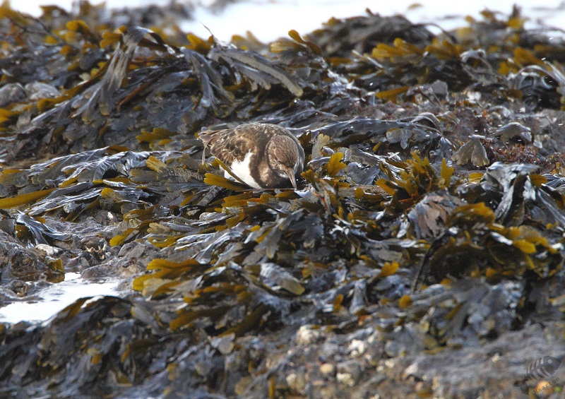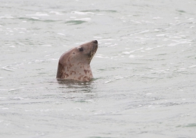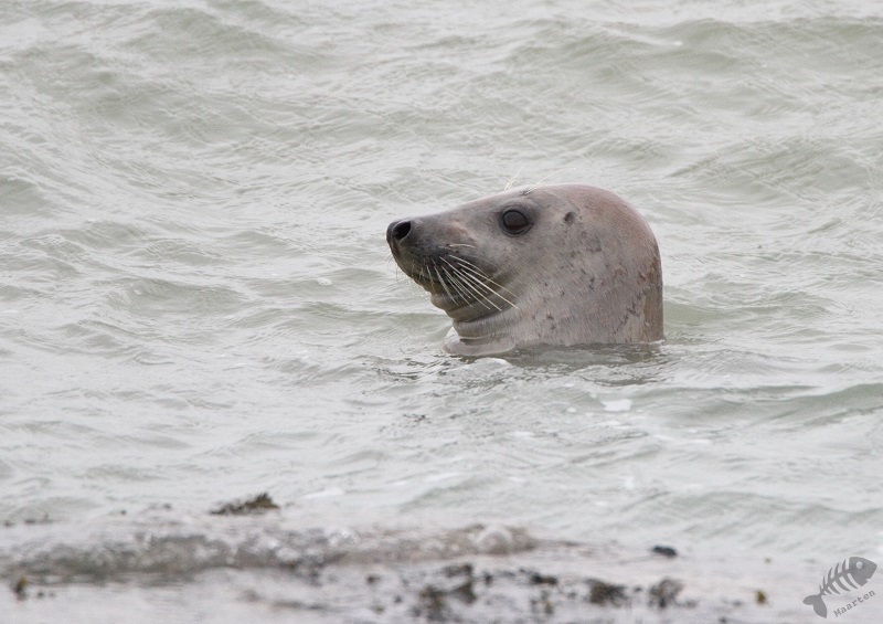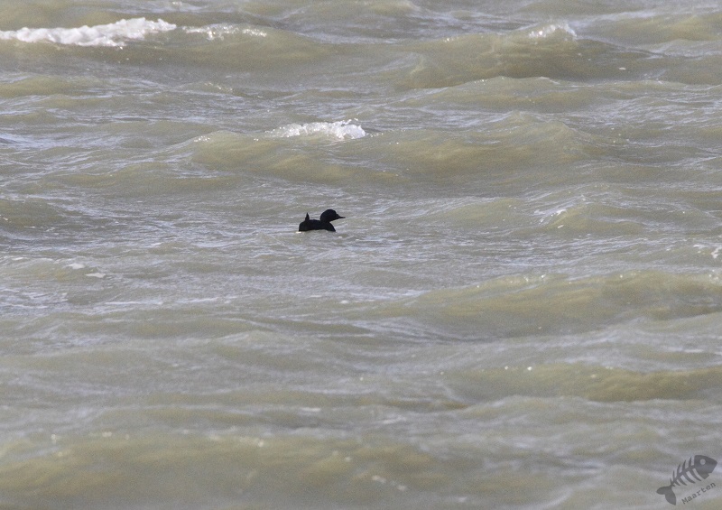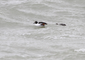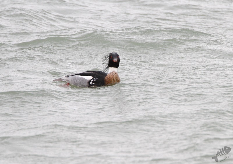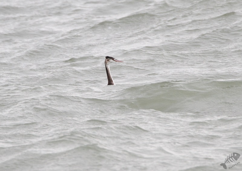 Bij de dam aangekomen was het min of meer droog geworden, maar in het Noorden zagen we hetzelfde als bij de Stellendam: niet veel… Weer verder gereden dus en gestopt bij de spuisluis. Daar was gelukkig wel het één en ander te zien. Bij de sluis zaten weer verschillende Grijze Zeehonden en verder op zee zwom een koppeltje Brilduikers en een Middelste Zaagbek. Het vrouwtje van de Brilduiker had een heel vreemde manier van zwemmen: ze lag heel laag op het water, bijna plat. Het waaide enorm en of dit haar gedrag verklaarde? Toen ik verder liep tot voorbij de sluis, zag ik een groepje kleine duikertjes. Het bleken Kuifduikertjes te zijn (moet dit thuis altijd wel even nakijken in “Petersons”) vergezeld door één Fuut in winterkleed. Opvallend was dat één van de Duikertjes al een beetje zomerkleed droeg. Uiteraard zaten er de nodige Zilvermeeuwen en Kokmeeuwen en was er een Steenlopertje aan het rondscharrelen tussen de keien. Omdat het weer er niet beter op werd, besloten we door te rijden naar de Plompe Toren aan de Koudekerkse Inlaag. Toen we daar in de buurt kwamen, het is maar 10 minuten rijden vanaf de Brouwersdam, was het nog harder gaan regenen en besloten we iets nieuws te proberen.