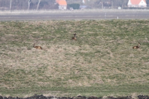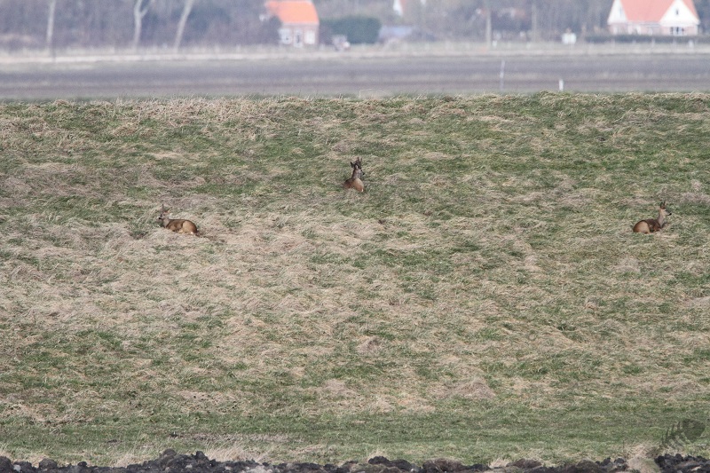 Gelukkig had de zon besloten ons te blijven vergezellen en het zag er meteen anders uit. Misschien lag het aan de zachte winter, maar ook hier was het behoorlijk rustig. Met name het aantal soorten was laag, de hoeveelheid Ganzen, Brand- en Grauwe, maakte de totale hoeveelheid vogels wel goed. Helemaal leuk was dat op de binnendijk 3 Reeën bleken te rusten. We hebben een tijdje naast de Plompe Toren op de dijk gestaan en deze fraaie dieren staan bewonderen.