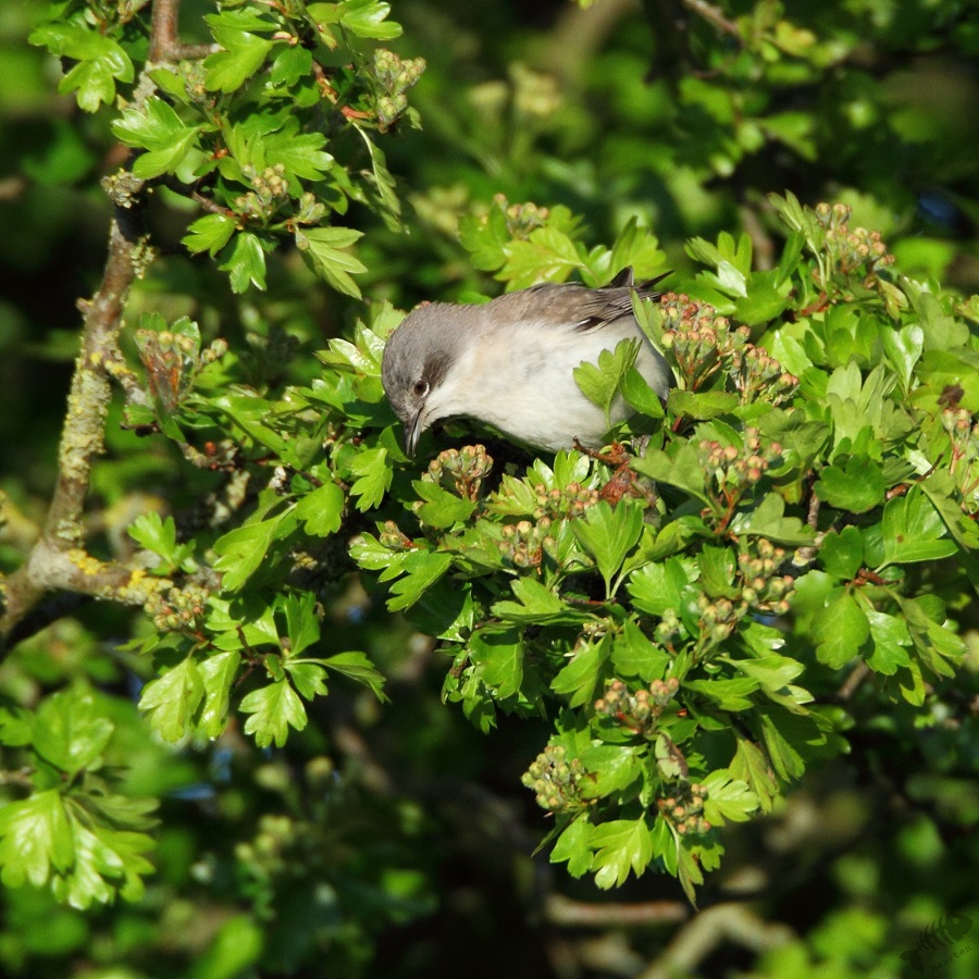 Terwijl ik met deze bezig was, hoorde ik weer een overbekende ratel. Niet die van de Sprinkhaanzangers, die waren akelig stil. Er zat een Braamsluiper in een naburige Meidoorn te zingen. Ik heb mij tijdens het begin van mijn vogelarij een aantal dagen bezig gehouden met deze soort, voordat ik wist wie hij was. Hij zat op weg naar mijn lagere school en ik hoorde hem iedere ochtend. Pas toen ik verschillende cassettebandjes kreeg met vogelgeluiden erop, kwam ik hem tegen en wist ik wie hij was. Ook toen al leefden ze dus verscholen en waren ze moeilijk te zien. Er was nu niets veranderd. Ik heb een hele tijd naar de struik staan kijken, maar zag de Braamsluiper niet. Ik heb het maar even zo gelaten en ben het terrein ingegaan. Ik had nog maar een klein stukje gelopen toen ik hem weer duidelijk hoorde “ratelen”. Ik draaide me om en tot mijn grote verbazing en plezier zat de zanger aan de buitenkant van de struik te zingen terwijl hij druk bezig was voedsel te zoeken. Ik heb wat plaatjes kunnen maken en had hem dus weer eens!