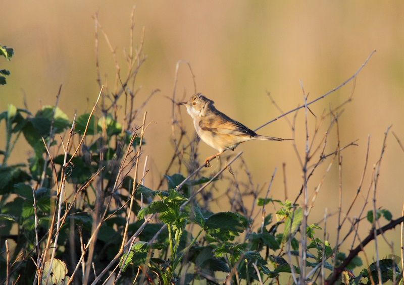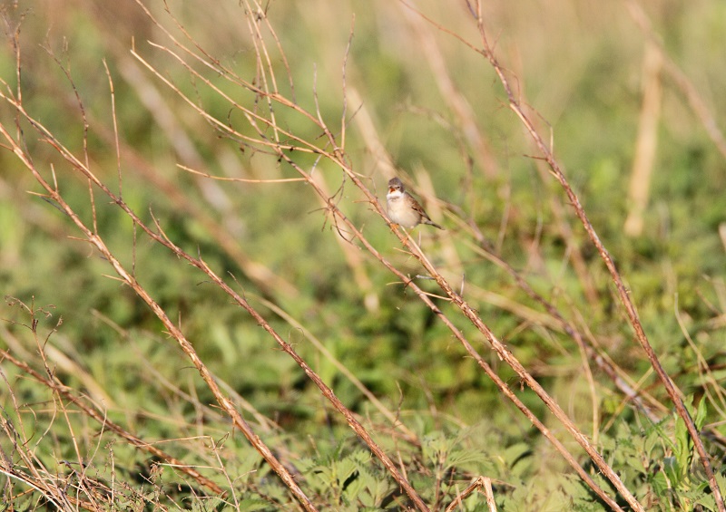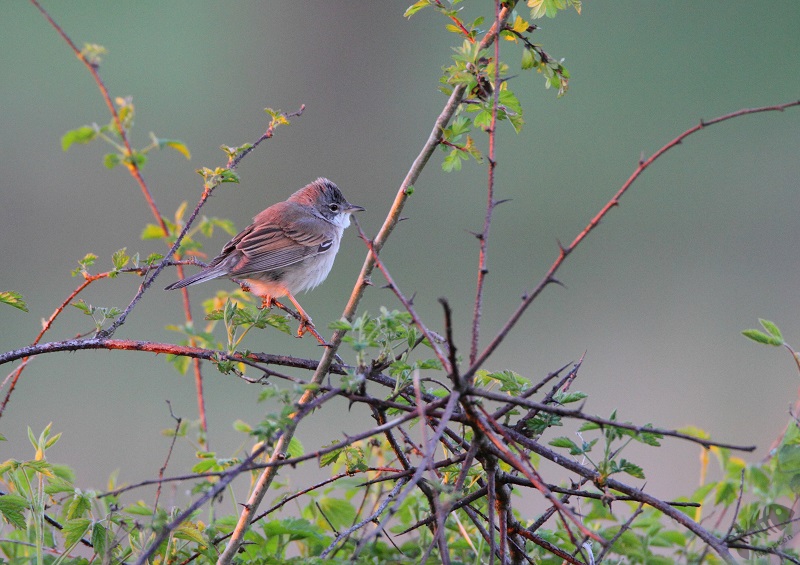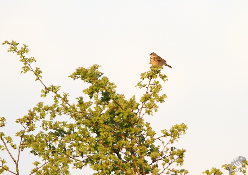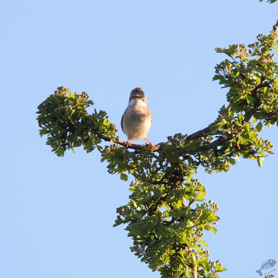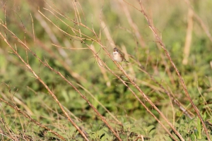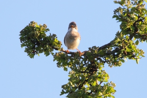 De zon begon al te zakken en gaf een oranjige kleur aan de opnamen. Het werd al duidelijker bij een volgende Grasmus die ik tegenkwam. Omdat het licht snel afnam, ben ik niet zó ver gelopen. Ik kwam tot een dwarspad waarvan ik had gezien dat ook hier Sprinkhaanzangers zouden moeten zitten en ben richting de winterdijk gelopen. Ik hoorde inderdaad 2 Sprinkhaanzangers en heb misschien wel een half uur staan turen, maar vond ze niet… Een Graspieper in de verte in een Meidoorn was alles wat ik nog in beeld kreeg.