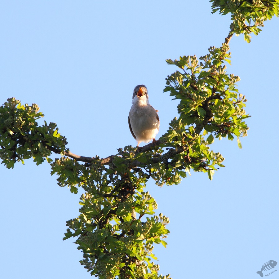 Ik was nu dus ’s avonds om half zeven aan de Veerweg en gelukkig klonk nu ook overal zang. Al snel zag ik een bekende Grasmus, maar mooi poseren wilde deze niet. Een 2de, iets verderop, bleef wel aardig zitten, maar zat iets te hoog om mooi uit te komen.