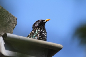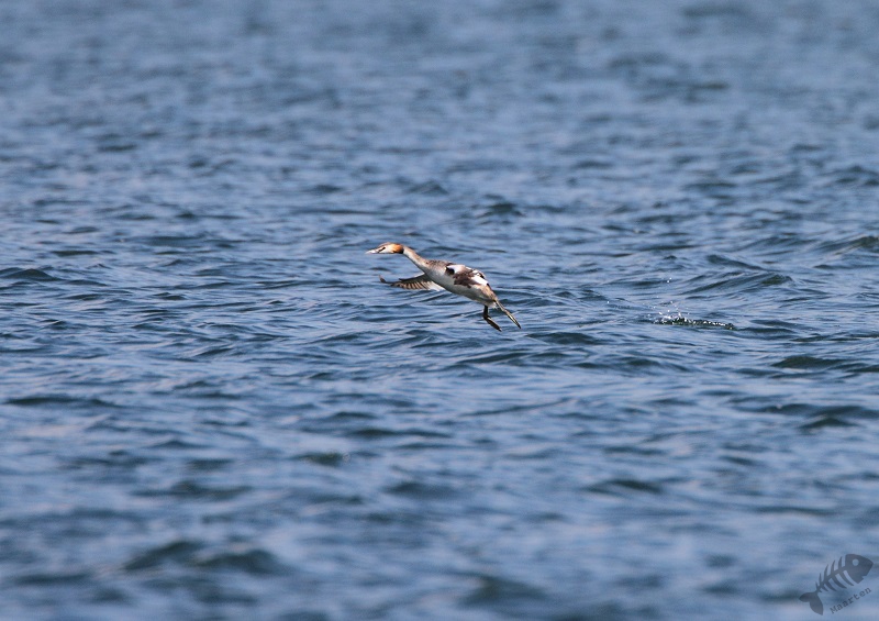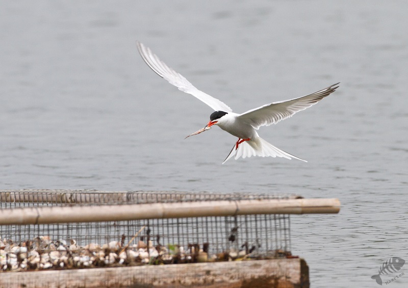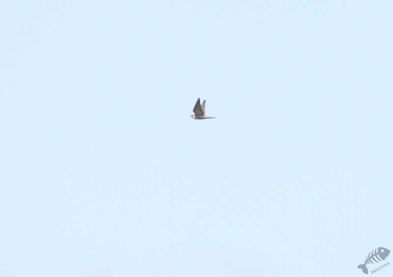 22 April had ik helaas alleen de gelegenheid de hut te bezoeken. Na een snelle foto van een Spreeuw welke bij onze buren onder het dak broed (deze zitten er al jàren, het was zo’n beetje de eerste soort welke ik van wat dichterbij te zien kreeg, misschien wel 40 jaar geleden…). Er zaten gelukkig al verschillende Visdiefjes, dus het “jagen” kon beginnen. Ik kon even oefenen op een voorbij vliegende Fuut. Dat was ook wel nodig. Het blijft enorm lastig door vrij smalle kieren foto’s te maken. Wat het nog lastiger maakt, is de snelheid van de objecten en je kijkhoek van slechts 4°! Om het bijna onmogelijk te maken, houd ik mijn camera op een statief waardoor je wendbaarheid ook afneemt en ik uiteindelijk dus eigenlijk blij ben met elke scherpe foto van een beetje geringe afstand. Een geluk op deze dag was dat het behoorlijk waaide, waardoor de vogels soms wat minder snel waren. Terwijl ik zo bezig was, kwamen er verschillende mensen even in de hut. Onder hen was ook een echte vogelaar die kwam kijken of er misschien nog andere Sterntjes te zien zouden zijn. We raakten aan de praat en het bleek dat hij uit Kekerdom kwam. Dit ken ik natuurlijk vrij goed, omdat hier de toegang naar de Millingerwaard ligt. Hij kon het nodige interessants vertellen en wist ook dat de nestkast voor de Slechtvalken in de elektriciteitsmast verderop inderdaad bewoond was. Hij had het nog niet verteld of er vloog er één van de mast weg en stak in de verte, voor ons, de plas over. Dat was natuurlijk erg leuk, maar misschien nog interessanter was het nieuws dat in de kerktoren van de Sint Martinus van Cuijk, óók een koppel zat te broeden! Hier had ik helemaal geen weet van en ben op de terugweg wel gaan kijken of ik ze kon vinden. Helaas lukte dat niet, dus dat moest ik nog maar eens vaker gaan proberen…