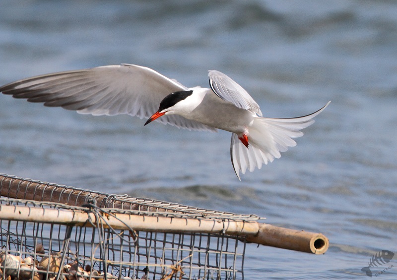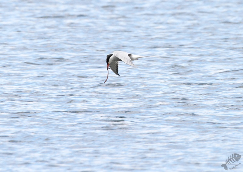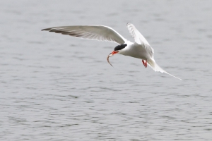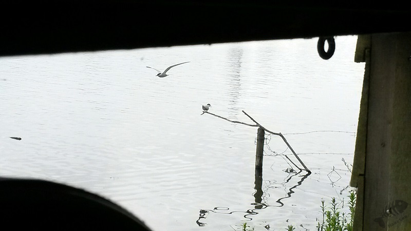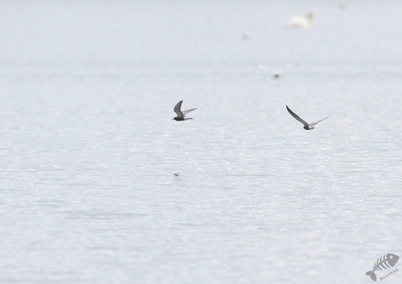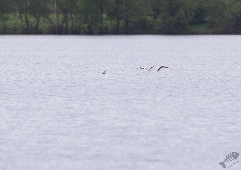 Terwijl ik daar mee bezig was, viel het me op dat er ook verschillende donkere Sterntjes rondvlogen. Toen ik ze beter in beeld kreeg, bleken dit Zwarte Sternen te zijn! Er zaten dus inderdaad meerdere soorten. Jammer was dat zij op grote afstand bleven en de foto’s maar heel matig werden. Ook vloog er een zwerm Kokmeeuwen rond die druk bezig was de Visdiefjes lastig te vallen. Wanneer er een Diefjes met prooi aankwam, zaten zij er direct achteraan. Je ziet dit wel eens in natuurfilms met Roofmeeuwen, maar hier op de plassen…!