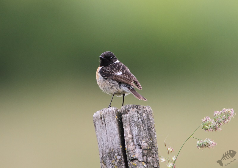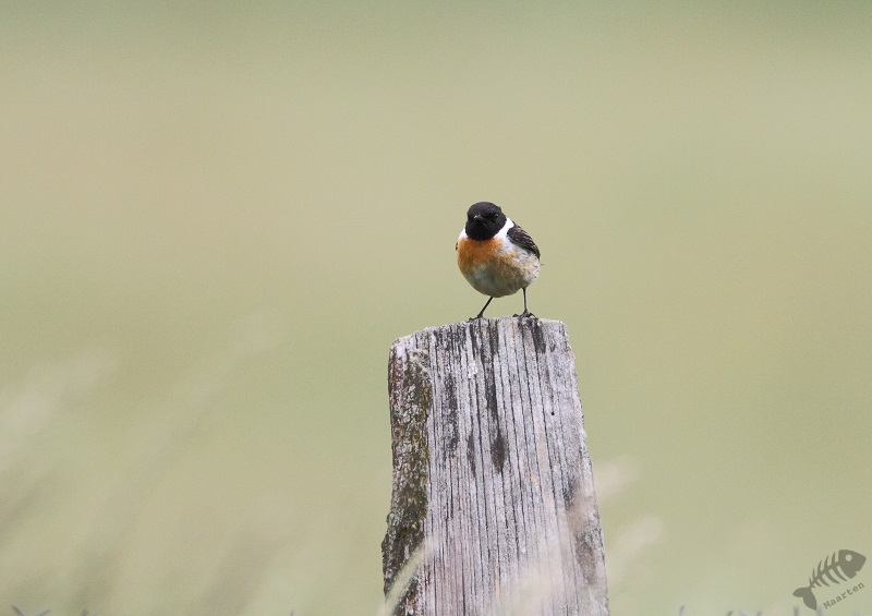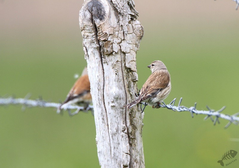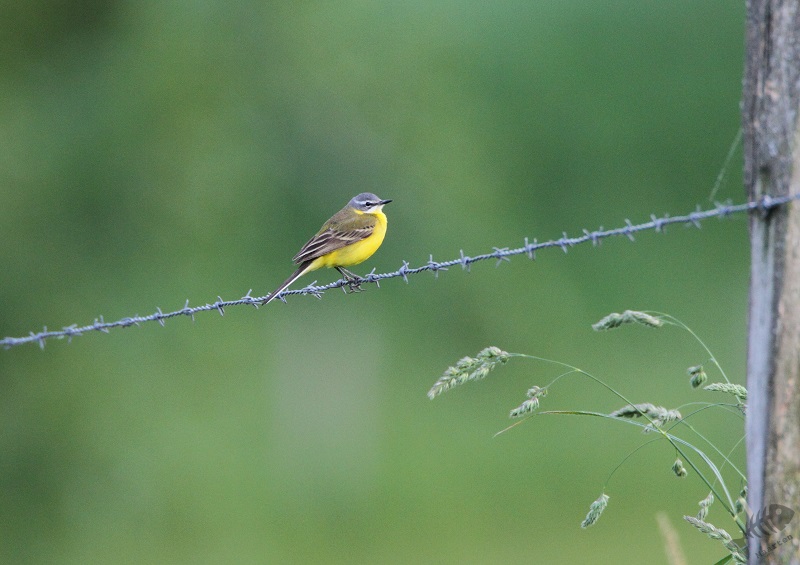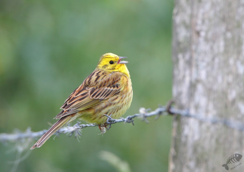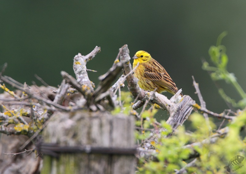 Op mijn tochten heb ik al een aantal keer een zang gehoord die ik niet thuis kon brengen. Het leek een beetje op de ratel van de Braamsluiper, maar was het net niet. Ook klopte de plaatsen niet waar ik het hoorde met de omgeving waarin je een Braamsluiper verwacht. Ik ben het eens gaan uitzoeken en kwam erachter dat het de zang van de Cirlgors moest zijn. Vanaf nu zou je de vakantie kunnen betitelen als: “La Chassagne, ofwel: zoektocht naar de Cirlgors”. Ook deze vogel was uiterst moeilijk in beeld te krijgen, terwijl ik hem steeds vaker ging horen. Het begon een beetje te lijken op mijn zoektocht naar de Cetti’s Zanger (het zal hem wel in de beginletter zitten…). Deze keer dacht ik dat het goed zou zijn voor de afwisseling om eens ’s avonds te gaan. Op de weg naar beneden bleek tot mijn verrassing ook een Grauwe Klauwier te zitten, vlak bij de camping dus! Vlak bij Les Gazeriers, aan de grotere weg in mijn rondje dus, kreeg ik een Spotvogel in het gehoor. Ook kreeg ik hem vluchtig te zien en kon hem vastleggen. Terwijl ik daar zo mee bezig was, ging er een vogel op de elektriciteitsdraad zitten. Snel foto’s gemaakt, ik kon niet direkt zien wat het was, en toen ik deze beter bekeek, leek het of het het wijfje van de Cirlgors was. De verschillen met de Geelgors zijn subtiel, zeker bij de wijfjes, maar een geel petje ontbrak bij dit exemplaar zodat het eigenlijk wel een Cirlgors moest zijn. Iets verderop in een grote oude boom had ik het geratel al eens gehoord dus misschien dat dit wijfje wel bij hem hoort… Ik ben nog een keer naar de weiden met de Klauwieren gereden, maar zij zaten er niet, maar ik kreeg wel gelegenheid een mannetje van de Roodborsttapuit mooi vast te leggen. Toen het daar bij bleef ben ik weer naar huis gereden. Het toeval wilde dat ik bij de grote boom het geratel weer hoorde. Ik heb een hele tijd bij deze boom gestaan, maar ondanks zijn verwoede zang, waardoor ik zijn plek aardig kon bepalen, kreeg ik hem niet in beeld. Ik ben toen maar verder gegaan en kwam met heel mooi licht bij het steile pad. Daar deed een Geelgors ook heel erg zijn best om gehoord te worden, maar een groot verschil was, dat hij ook prachtig in beeld kwam. Ook de Grauwe Klauwier liet zich weer even zien op een hooistapel, alsook een Witte- en Gele Kwikstaart. Maar het mooist kwam toch als laatste. Ook nu weer deed een Geelgors heel erg zijn best, en zat prachtig te zingen op een paaltje. Een hele tijd kon ik hem observeren en ik kon zelfs een filmpje maken. Het was dan misschien niet de Cirlgors, maar fraai was hij wel!