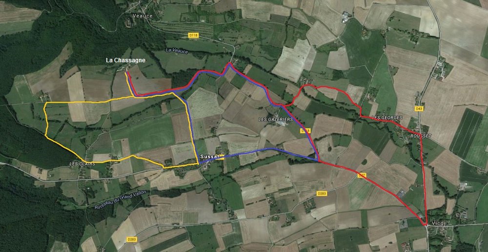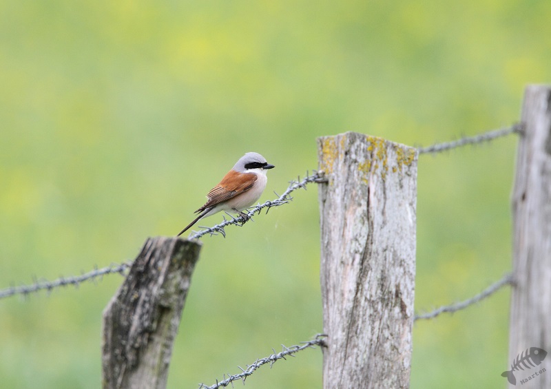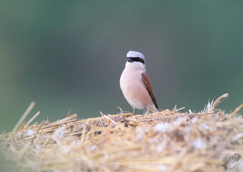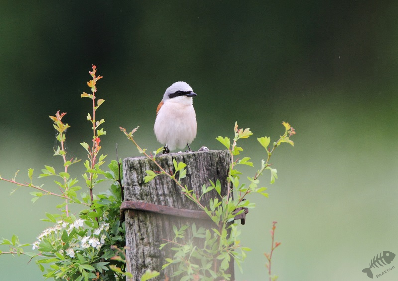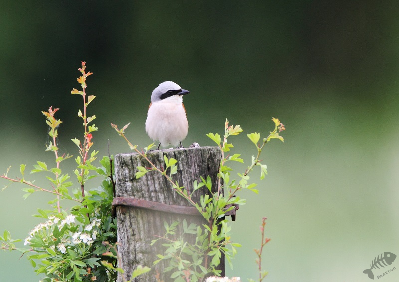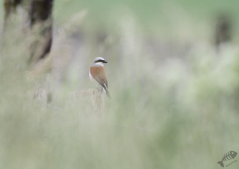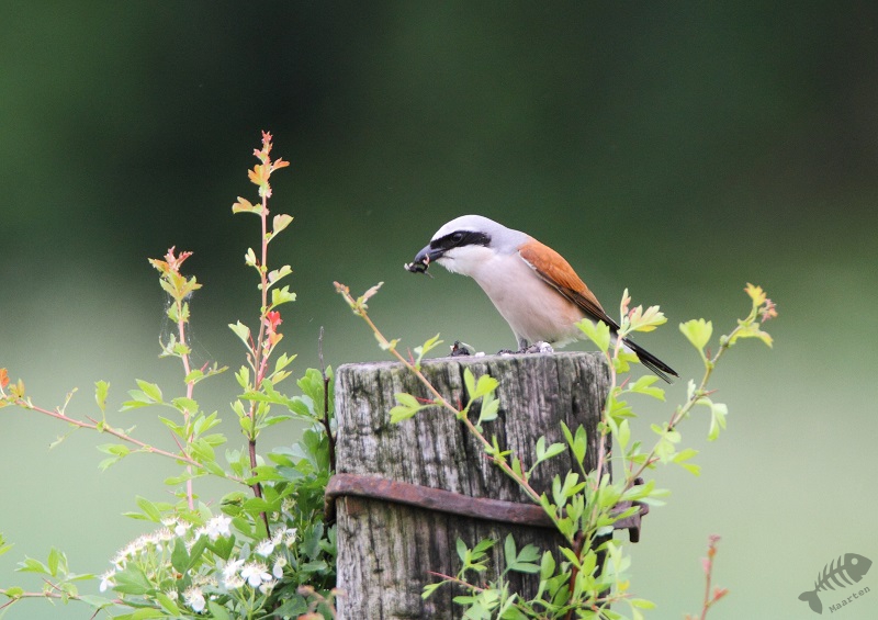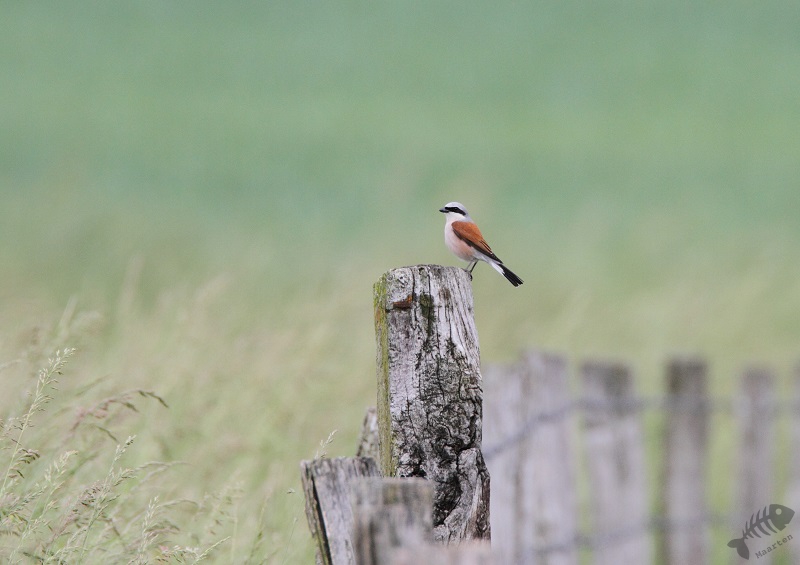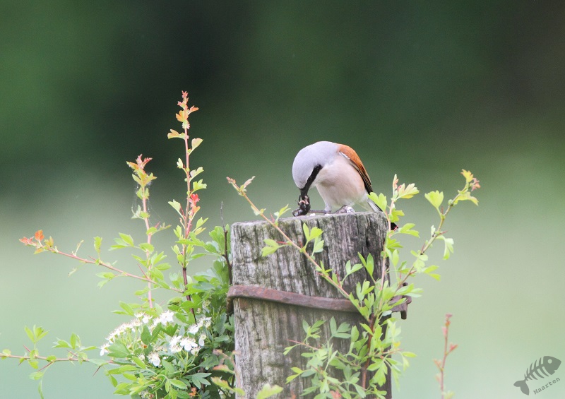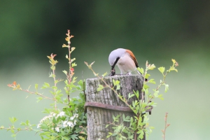 De volgende dag heb ik een eerste vogeltocht gemaakt (de rode). Aan de toegangsweg naar de camping was het rustig (Géén Paapjes!!), zodat ik besloot verder te rijden en de openbare weg op ben gegaan. In een t-splitsing, net voor Les Gazeriers, hoorde ik in de bosjes Nachtegalen! 2 Exemplaren zaten tegen elkaar op te zingen. Wat een prachtig gehoor! Ik ben links afgeslagen en heb geprobeerd de zangers in de bosjes te ontdekken, wat niet lukte… Ik ben toen het weggetje maar gaan volgen en op een bepaald moment moest ik het beekje “La Veauce” doorwaden. Ik hoopte op misschien een Waterspreeuw of een Grote Gele Kwikstaart (op de lijst die op de camping hangt, staan deze soorten als waargenomen in de buurt van de camping…), maar ik zag alleen een Roodborstje. Na het beekje ben ik rechtsaf gegaan en rustig tussen kleine weiden doorgereden, richting Les Georges. Opeens zag ik een vogel verderop op een paaltje zitten. Ik moest een seconde denken, maar toen wist ik ook zeker wat het was, een Grauwe Klauwier! Direct heb ik de auto stilgezet en heb een half kaartje volgeschoten met deze prachtige vogel! Het was nog lastig, aangezien hij wat verder weg zat, achter hoog bermgras. Ineens vloog de vogel weg en ging hij iets verderop op een paaltje zitten. Het bleek dat hij een dikke Kever gevangen had en deze ging zitten ontleden en opeten. Weer kon ik iets dichterbij komen en ik kreeg steeds mooiere foto’s. Toen ik uiteindelijk dacht genoeg te hebben, ben ik doorgereden naar Vicq en vandaar weer richting Sussat en naar La Chassagne.