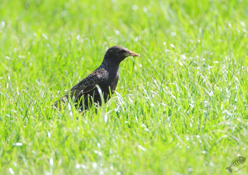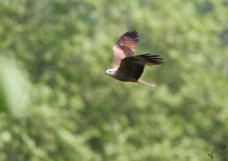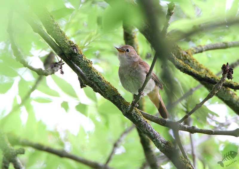 De volgende dag had ik bedacht hetzelfde rondje nog maar eens te doen en als eerste wilde ik mijn geluk beproeven bij de Nachtegalen. Toen ik in de buurt kwam, hoorde ik ze al zingen en weer ben ik tussen de bosjes gaan staan. Nu hoorde ik de zang van de rechterkant komen en na lang turen, terwijl de vogel prachtig bleef doorzingen, vond ik hem! Heel snel heb ik een reeks foto’s gemaakt, waarbij de camera niet optimaal afgesteld stond, en na een paar aanpassingen heb ik er nog een serie gemaakt. Omdat de Nachtegaal bleef zitten, hoopte ik nog een filmpje te kunnen maken, maar toen ik een paar seconde had, vloog hij helaas weg. Maar wat had ik hem mooi! Ik ben mijn rondje weer verder gaan rijden en helaas kwam ik nu geen Grauwe Klauwieren tegen. Daarom had ik dat gedeelte van de route snel af, waardoor er gelegenheid was op een ander punt iets verder te gaan. Daar trof ik een Gele Kwikstaart mooi op een hooiberg en weer terug op m’n route, een koppeltje Kneutjes op een draad. Helaas liet alleen “de zij” zich goed zien, maar door het getemperde licht kreeg de foto wel heel mooie kleuren. Toen ik terugkwam bij de camping, bleken de kinderen weer wakker en hebben we een beetje rondgelopen. Het weiland onderaan de heuvel voor de camping werd gemaaid en dit lokte verschillende vogels. Tot mijn verbazing zat hier ook een Zwarte Wouw tussen! Door de drukke achtergrond en het snelle vliegen, kreeg ik hem maar niet in focus, waardoor ik het handmatig heb geprobeerd. Optimaal was dit niet, maar ik kwam dichterbij dan m’n camera waardoor ik uiteindelijk best acceptabele plaatjes heb gekregen.