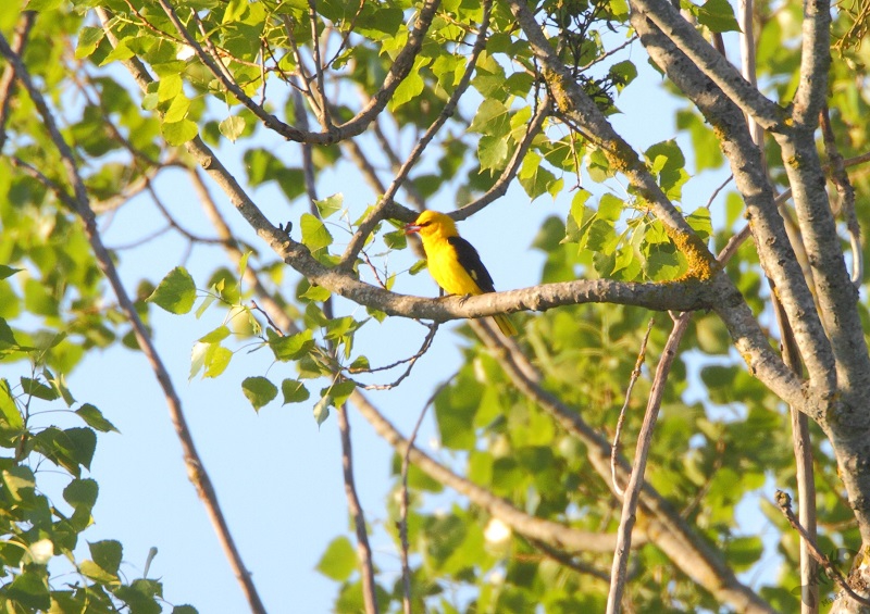 Ik had bedacht dat ik minstens één ochtend vroeg zou opstaan om al het zang geweld en rondvliegende vogels vast te leggen. Het pakte anders uit… Vroeg op was ik, maar vogels lieten zich niet horen, laat staan zien! Niks kreeg ik in beeld. De Nachtegaal was er niet, de Klauwieren niet, eigenlijk helemaal niets dus. Wel hoorde ik in de bomen langs de weiden van de Klauwieren een geluid dat ik in Nederland nog niet (heel vaak) gehoord heb. Er bleken verschillende Wielewalen te zitten die hun prachtige ge-dudeljoo veelvuldig lieten horen. Helaas kreeg ik ze maar niet in beeld en na zo’n anderhalf uur besloot ik maar richting de camping te gaan. Toen ik het laatste stuk richting de camping reed, het steile pad omhoog, hoorde ik weer de Wielewalen (ik had ze ook al een aantal keer vanaf de camping gehoord, maar nooit gezien) in een bomenrij aan de overkant van een klein weiland. Toch de auto maar gestopt om te kijken en tot mijn grote blijdschap zag ik nu 2 exemplaren! Het was ver weg en het licht was lastig, maar het is me gelukt foto’s te maken van deze prachtige vogels. Ik heb zelfs een kort filmpje gemaakt, waarin de Dudeljoo te horen is. Door deze vogels was het vroege opstaan dubbel en dwars waard geweest!