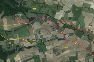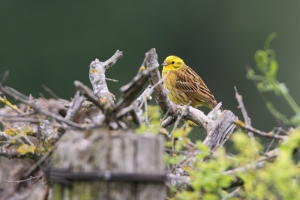 Om de vogels in de “rode route” wat rust te gunnen, ben ik een keer een andere kant uit gegaan. Zo ontstond te “gele route”. Deze was het eerste gedeelte wat tricky, aangezien de middenberm nogal hoog was en hoog begroeid. Ook was het pad niet zo best, wat de reden was dat ik nog niet eerder zo gegaan was. Aan het einde van het pad kon ik linksaf en ging er een asfalt weggetje richting een bos. Al heel snel zag ik een soort welke een beetje gewoon begon te worden… Ook hier bleek een koppeltje Grauwe Klauwieren te zitten! Een dode boom niet ver van de weg bleek een favoriete plek waardoor ik het mannetje heel mooi kon vastleggen. uiteindelijk vond ik een weg richting Sussat en ging deze route over in de “blauwe route” en kwam ik weer uit op de grotere weg van de “rode route”. Rond dit tijdstip, midden op de dag, zat hier niet zo heel veel en kwam ik alleen nog een koppeltje Geelgorzen tegen op weg naar de camping. ’s Avonds ben ik dit rondje nog een keer gaan rijden. De route gaat door een soort buurtschapje en hier zag ik voor het eerst het mannetje van de Cirlgors! Helaas bleek deze, als bij zoveel soorten, veel schuwer dan het vrouwtje, waardoor ik alleen van haar foto’s kon maken. Toen ik weer op de “rode route” zat, helemaal aan het begin, zag ik in een dode struik opeens weer een Gors-achtige vogel. Meteen gestopt, foto’s gemaakt tegen het licht in, maar het bleek een mannetje te zijn! Nu wist ik een beetje waar ik op moest letten en waar ik ze kon verwachten…