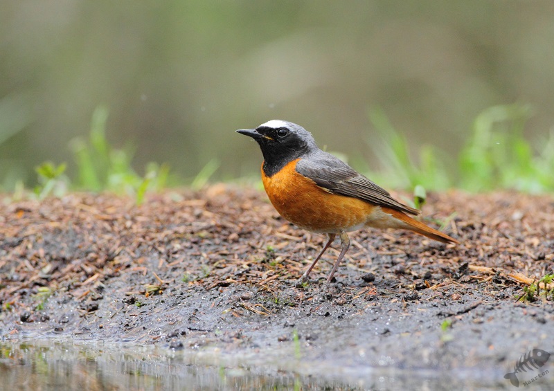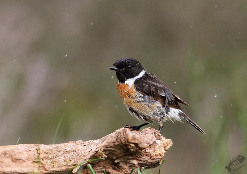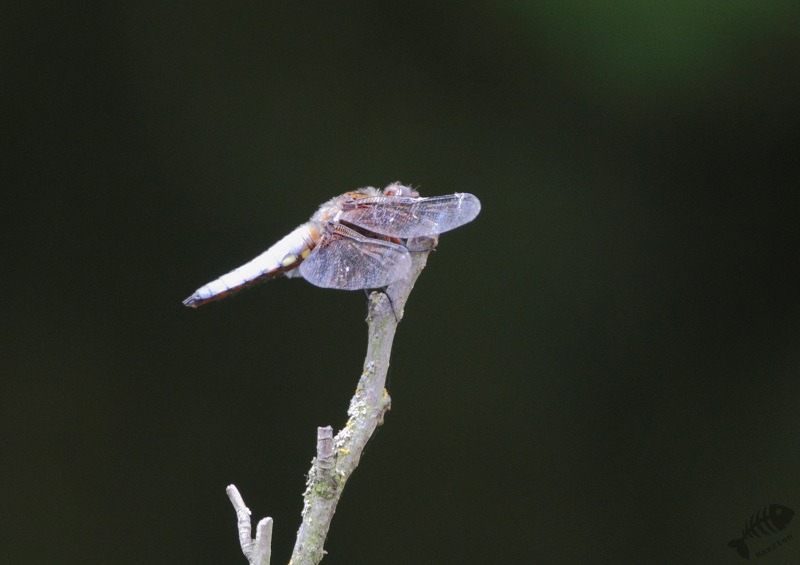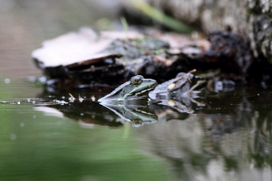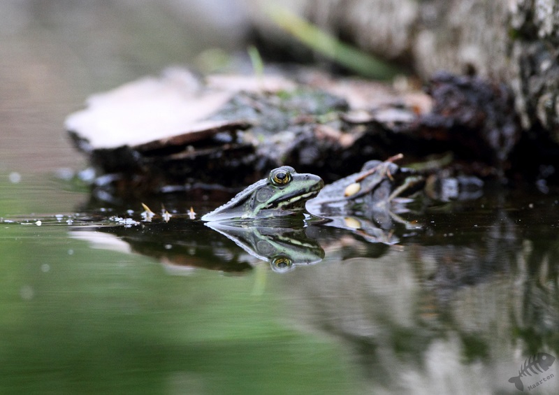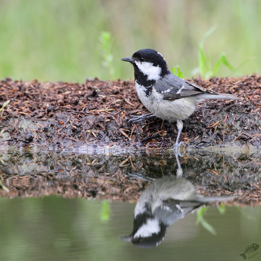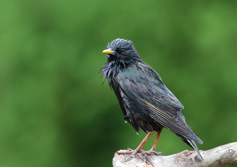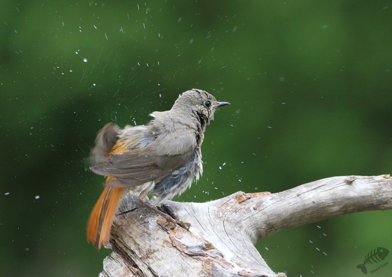 De hele ochtend ging het door met kortere en langere bezoekjes van verschillende soorten waarbij een aantal regelmatig terugkwam. Tegen de middag kwam er een, voor mij bij een schuilhut, heel nieuwe soort zitten. Een beetje een verlopen Spreeuw kwam een bad nemen. Ook na het bad zag hij er wat smoezelig uit, maar hij wilde tenminste wel even poseren. Het ochtendprogramma werd afgesloten door een Zwarte Mees en toen werd het toch weer wat rustiger. Tussen de middag heb ik me bezig kunnen houden met een paar Kikkers en Libellen, Platbuiken, want de vogels lieten het toen eventjes afweten. Bijna een uur lang klonk de alarmroep van een Vink. Daardoor kreeg ik hoop dat er misschien een rover zou verschijnen, maar deze blonken uit in afwezigheid. Wel ging de alarmroep maar door, en door, en doo…
