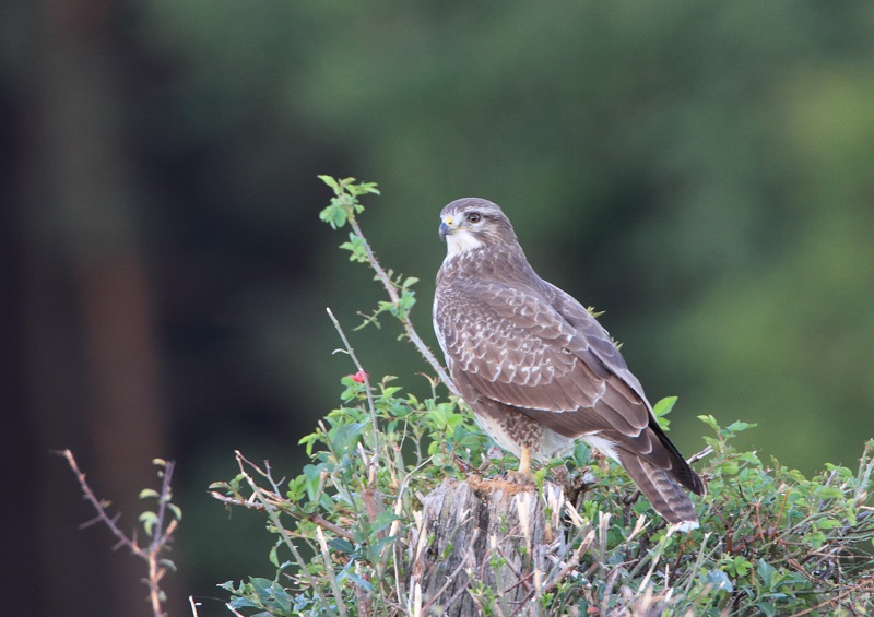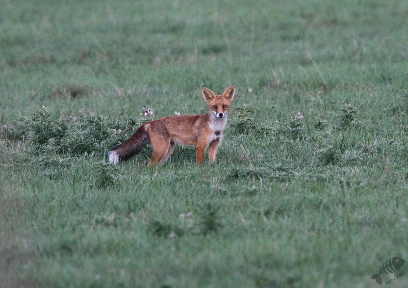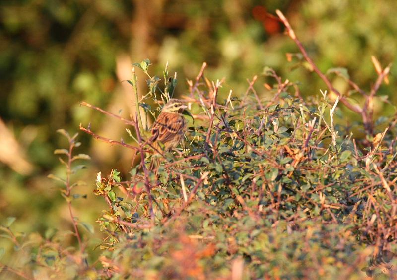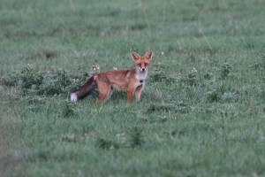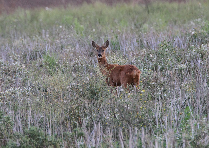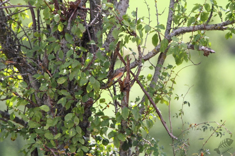 De eerste dagen hadden we prachtig weer en ben ik er verschillende keren op uit geweest. De eerste dag ben ik overdag op en om de camping gebleven. Al snel kwam ik 1 van mijn favoriete soorten tegen. Bij een klein stalletje met daarnaast een haag en enkele fruitbomen, zat een Gekraagde Roodstaart. Het was een eerste jaars mannetje: mooi in de veren, maar nog niet optimaal in de kleuren. Het was heel leuk toen bleek dat ik hem vrij goed kon benaderen en hij mij na verloop van tijd zelf benaderde! Hij kwam in één van de bomen naaste me te zitten en ik kreeg hem prachtig in beeld! Helaas bleef het na dit mooie begin erbij. Ik kreeg niks meer in beeld en heb de spullen weer opgeborgen. ’s Avonds ben ik vol goede moed de rondjes van eerder dit jaar weer gaan rijden. Direct op het pad waar ik aan het einde van vorige vakantie de Cirlgors had gezien, zag ik ze nu ook weer! Weer een sterk begin, kon niet mooier. Maar het bleek dezelfde kant op te gaan als die middag: er verscheen nauwelijks meer iets in beeld behalve, wat wel heel leuk was, een paar jonge Vossen en een Ree. Deze had ik hier eerder nog niet gezien, dus dat was heel leuk.