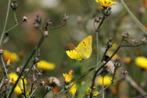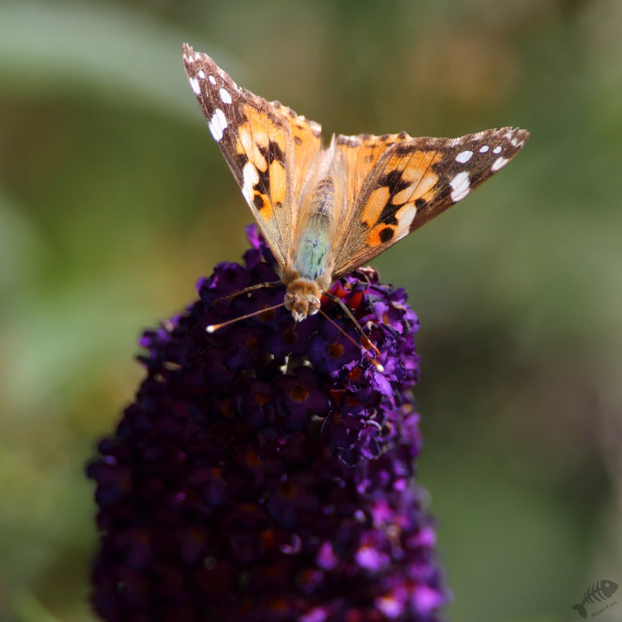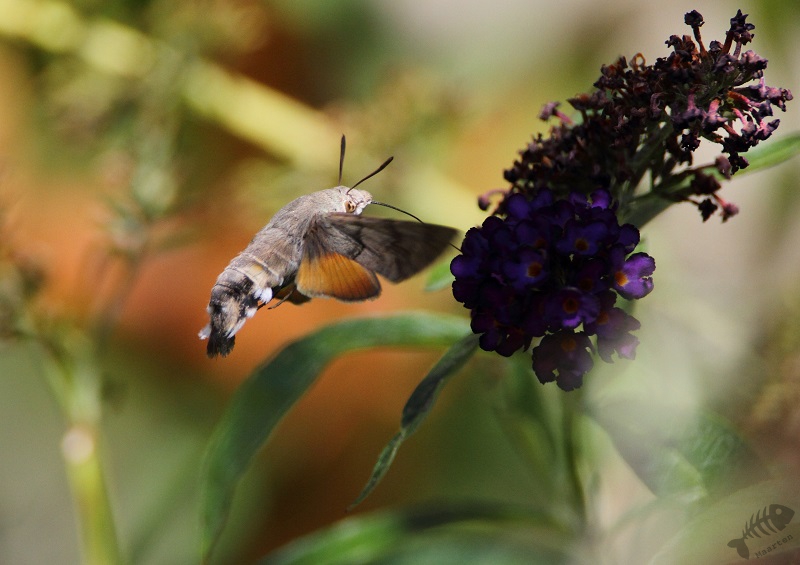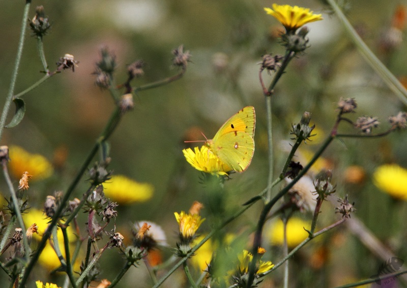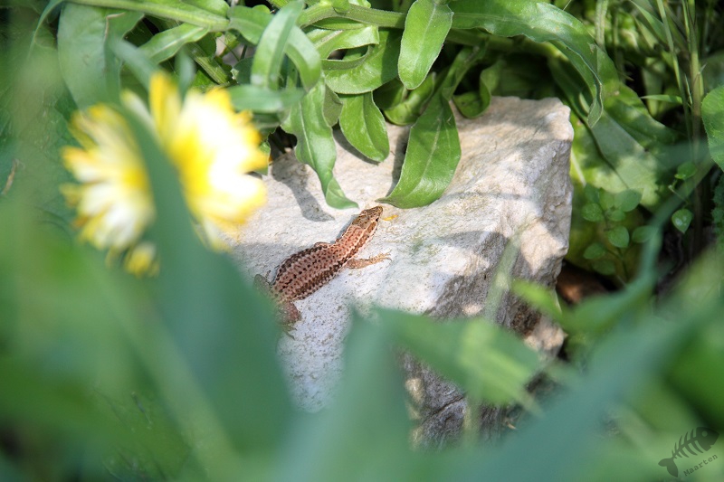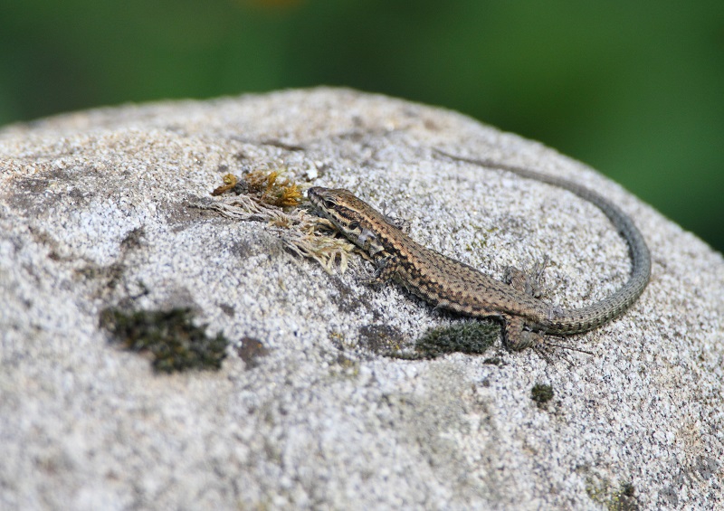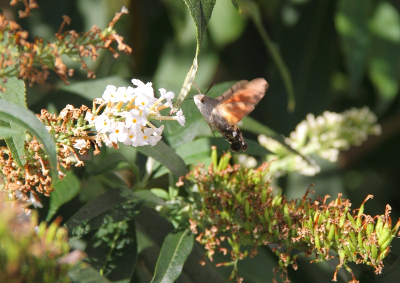 De volgende dag vloog, de wel bekende Buizerd, weer voorbij en heel hoog (té hoog) een Havik. Ook de Huiszwaluwen bleven op grote afstand, dus werden het allemaal afstandsplaatjes. Ik ben weer een rondje gaan rijden en kwam als eerste langs een prachtige akker vol wilde bloemen. Hier zaten verschillende Vlinders waarvan de Oranje Luzernevlinder wel heel erg in het oog sprong. Ik reed het rondje bovenlangs (de gele route) en hoorde aan de overkant van een akker een Groene Specht. Tot mijn vreugde kwam hij mijn kant uitgevlogen en ging in een appelboompje zitten waar ik niet ver vandaan stond. Helaas bleef hij aan de verkeerde kant zitten, flink verscholen, zodat ik hem niet in beeld kreeg en bleef het bij een wat vage opname van een Bonte Vliegenvanger en een heel vage Gekraagde Roodstaart. Later op de dag vlogen er verschillende Roofvogels over, waarvan ik denk dat het Wespendieven waren, maar ook hier was de afstand een probleem en werd determinatie wel heel lastig… Wat dat betreft deden de andere dieren op de camping het beter. Ik kreeg weer mooi een paar Muurhagedissen goed ik beeld en ook weer enkele Vlinders, waaronder de Kolibrievlinder, een heel bijzondere verschijning.