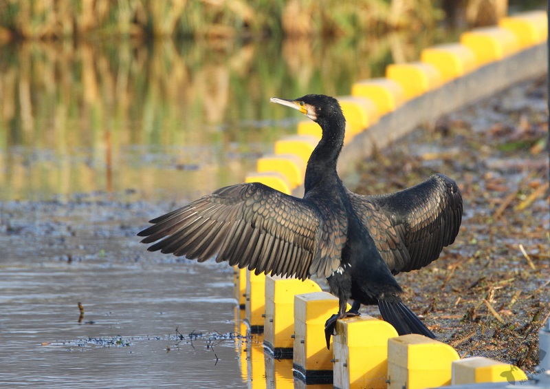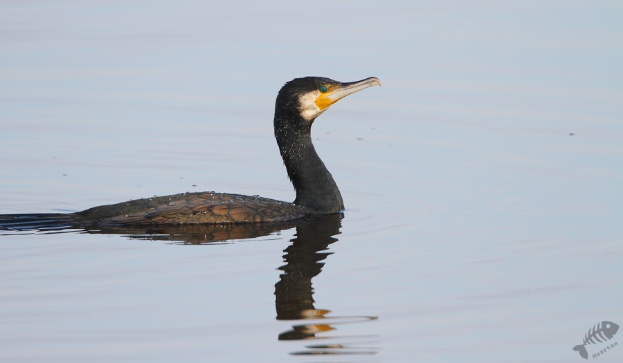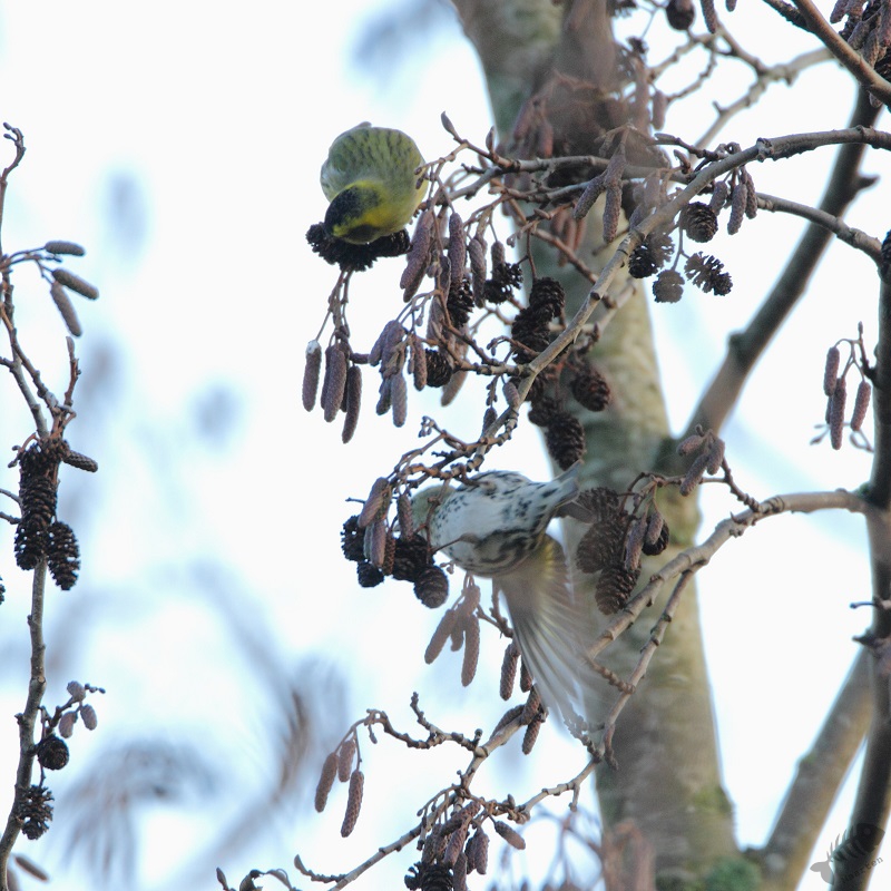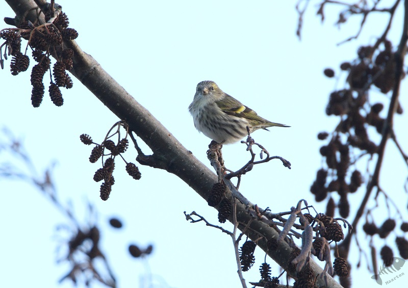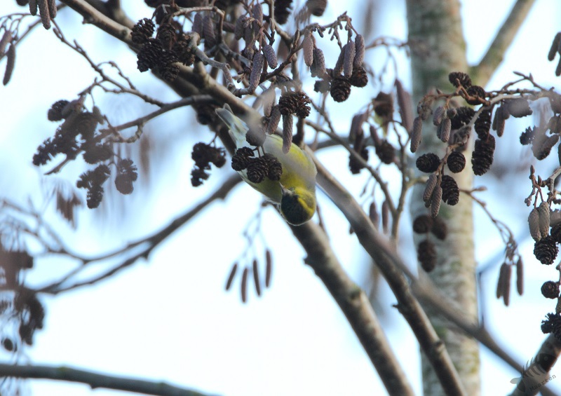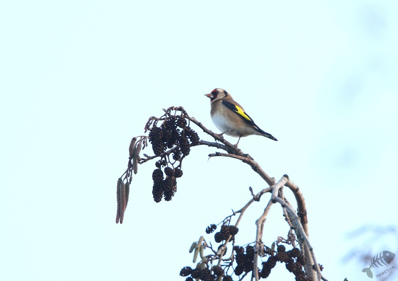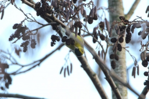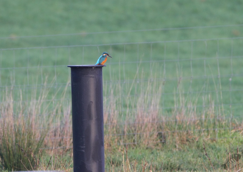 Maar dat bleek niet te kloppen. Allereerst was het een prachtige dag en heerlijk om buiten te zijn. Het was een mooie omgeving en er bleken nog een paar andere soorten vogels te zitten. In een paar hoge Elzen hoorde ik al snel het gekwetter van een groepje Sijsjes. Helaas zaten ze hoog en ver, maar ik kon het niet laten er foto’s van te maken. Net als van het Puttertje dat ook op de Elzenknoppen af was gekomen. Terwijl ik naar de Sijsjes stond te kijken, hoorde ik een paar keer het hoge gepiep van een IJsvogel. Het lukte maar niet hem in beeld te krijgen, totdat hij wat langer op een meerpaal in de Berkel ging zitten en ik hem vast kon leggen. Een Grote Zilverreiger heeft een hele tijd in een wei aan de overkant gestaan, dus kon ik die ook niet laten lopen. Een Aalscholver maakte het plaatje compleet.