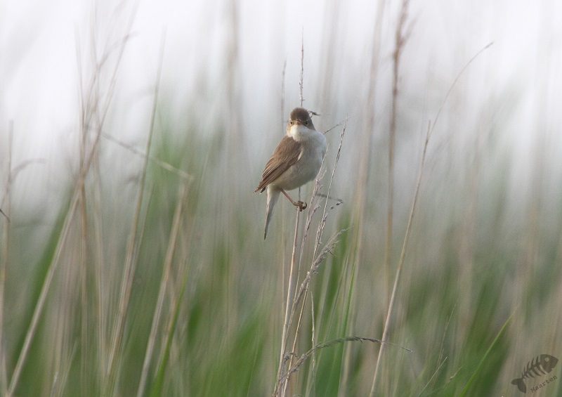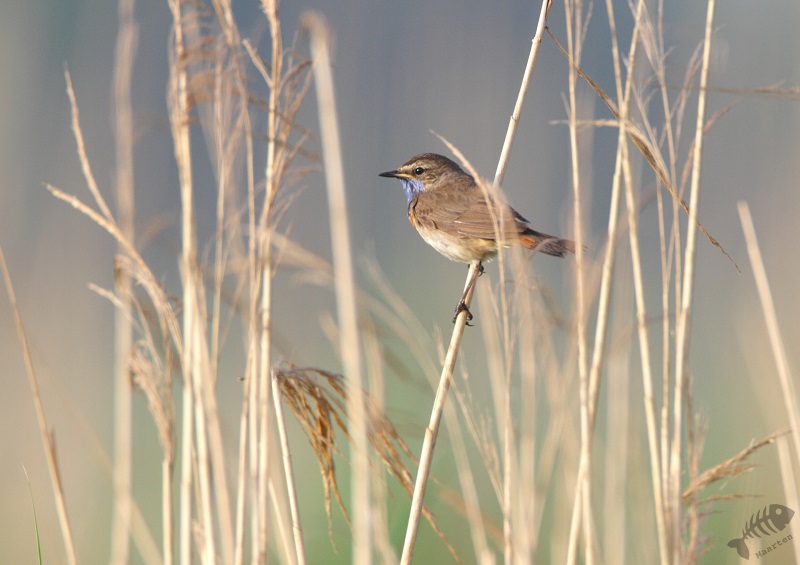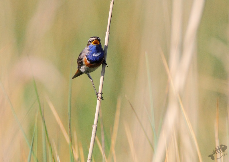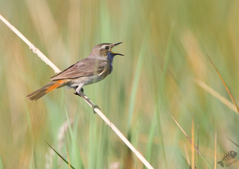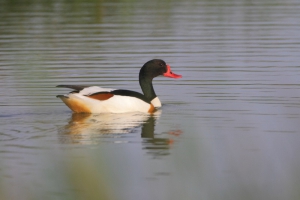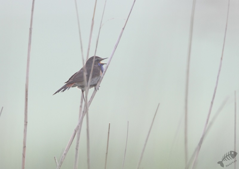 Bij aankomst zat er al een Blauwborstje op de parkeerplaats aan de Hogedijk en zaten er een Grasmus en een Bosrietzanger heel enthousiast te zingen, dus we begonnen goed! Na een bakkie koffie zijn we het gebied ingelopen en hoorde ik al verschillende Rietzangertjes. Hun zang kun je alleen associëren met voorjaar en zomer en de zon die steeds sterker werd (na dagen van regen…), bevestigde dit gevoel nog meer. Mijn eerste foto werd er één van een rustig voorbij zwemmende Bergeend en daarna ging het los. Op een klein stukje lukte het al de Rietzanger, Blauwborst en, ja ja, de Snor vast te leggen. Deze laatste bleek te druk bezig met voedsel verzamelen, zoals een heleboel andere vogels dat ook waren, zodat hij helaas niet zijn prachtige monotone gesnor kon laten horen.
