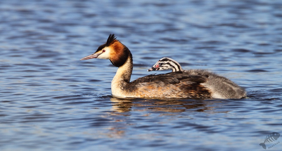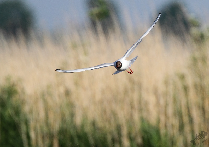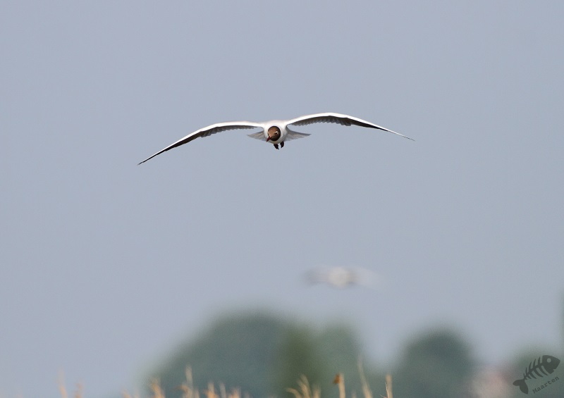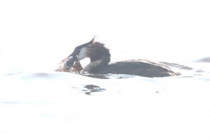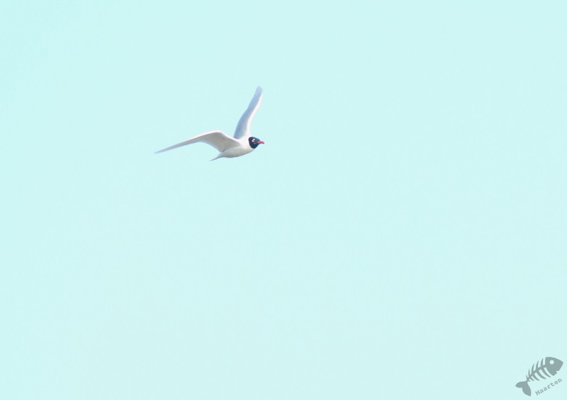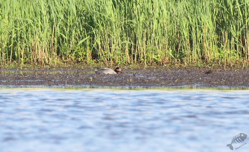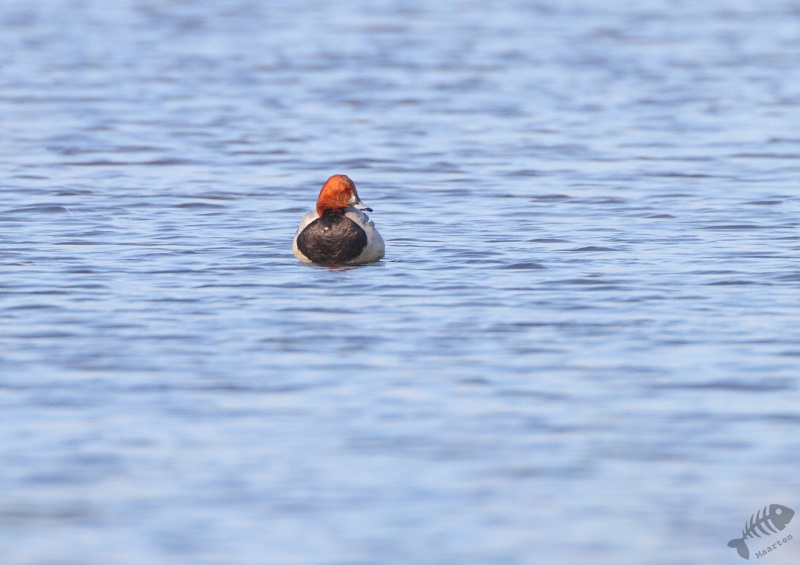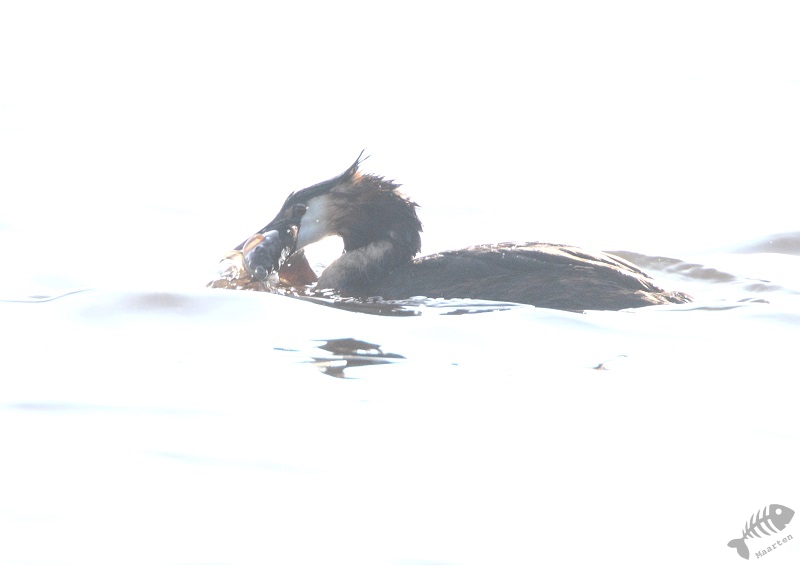 De hoek waar we op dat moment in stonden, bleek de moeite waard te zijn, zodat we er even bleven. Daarom was ik getuige van een Fuut die een “visje” gevangen had en hoorde ik een geluid dat ik niet kende. Het leek een beetje op zo’n piepballetje voor honden, maar dan meeuwachtig, en was zeer kenmerkend. Dit waren 2 Zwartkopmeeuwen die overvlogen en daarmee had ik weer een nieuwe soort te pakken! Vanaf het observatieplateautje had ik ook nog goed uitzicht op een kolonie Kokmeeuwen en een Wintertalinkje in de verte. Wat zijn dit toch prachtige Eenden. Toen we verderliepen kwamen we weer langs dikke rietkragen met z’n vaste, mooie bewoners en zag ik heel hoog een Buizerd-achtige vogel wat, moet ik heel eerlijk bekennen thuis op de computer pas te zien was, een Wespendief leek te zijn. In de uiterste hoek van het gebied waren we nog getuige van een puberend Futenjong wat nog mee wilde zwemmen op de rug van één van zijn ouders en verder bleef het redelijk rustig. Daarom besloten we terug naar de auto te gaan en in de Waverhoek te gaan kijken.