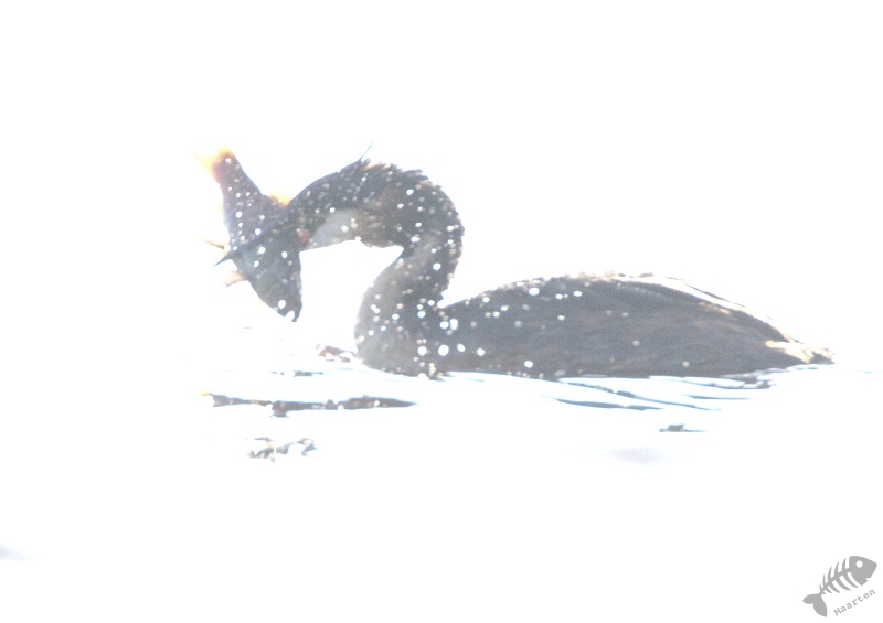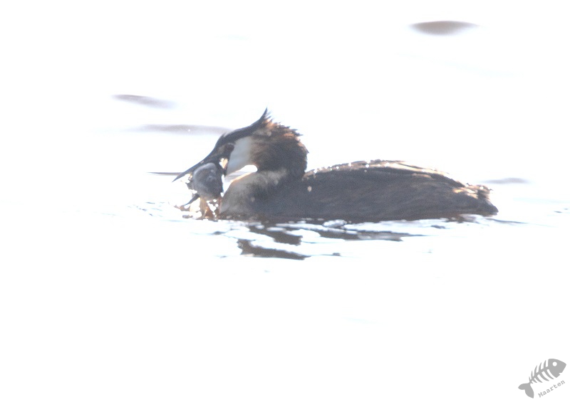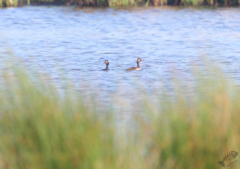 Arie was ondertussen een plas aan het inspecteren vanaf een verhoginkje en vond een andere soort welke we graag wilden zien. Ik kende ze alleen uit de winter in een wat soberder wit/grijs pak, maar in dit jaargetijde zijn ze zeer kleurrijk en prachtig om te zien. Ook dit koppeltje Geoorde Fuutjes bleef helaas wat ver weg, maar we pikten ze mooi even mee!